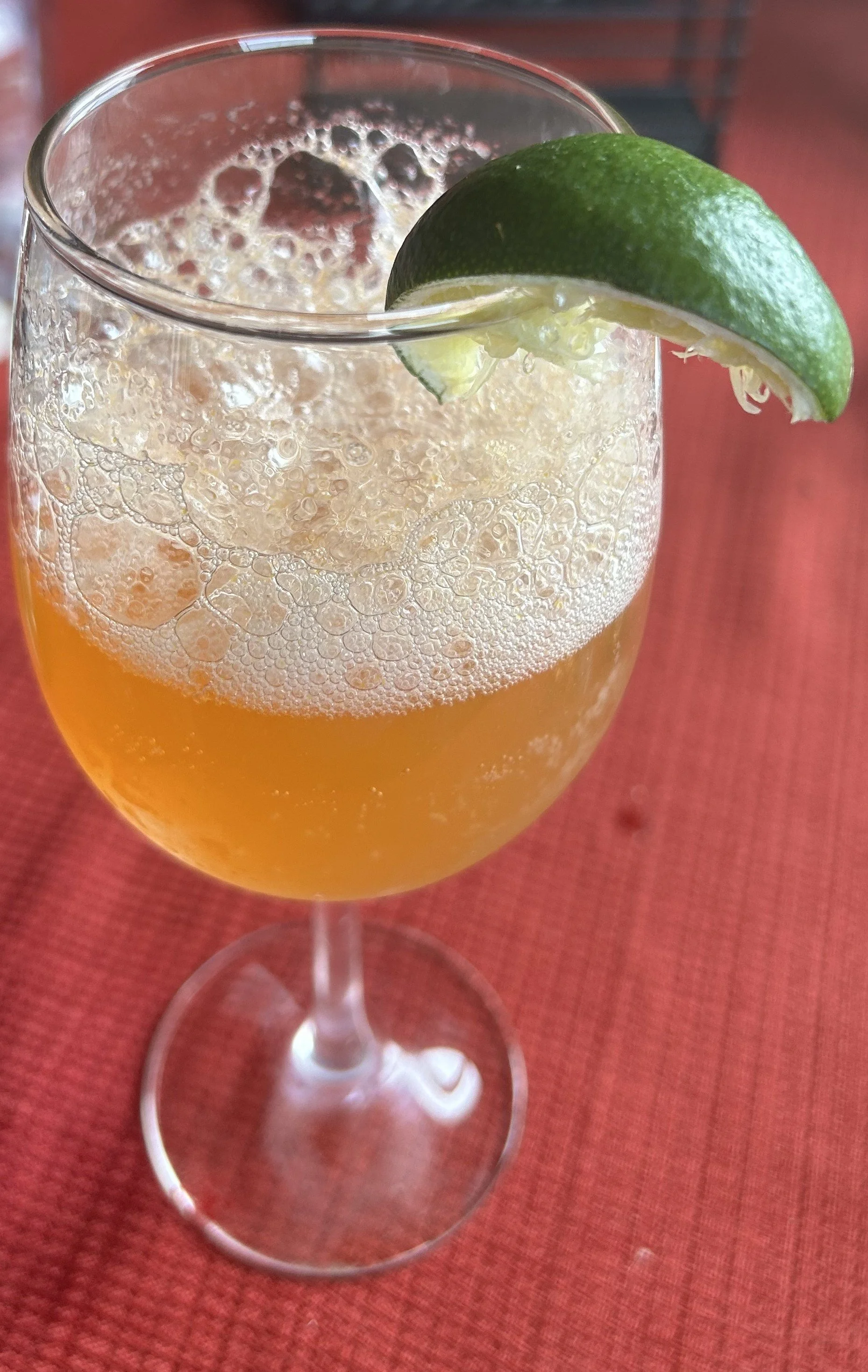Strain into a stemmed wine glass, then top with the sparkling wine and garnish with the lime wedge.