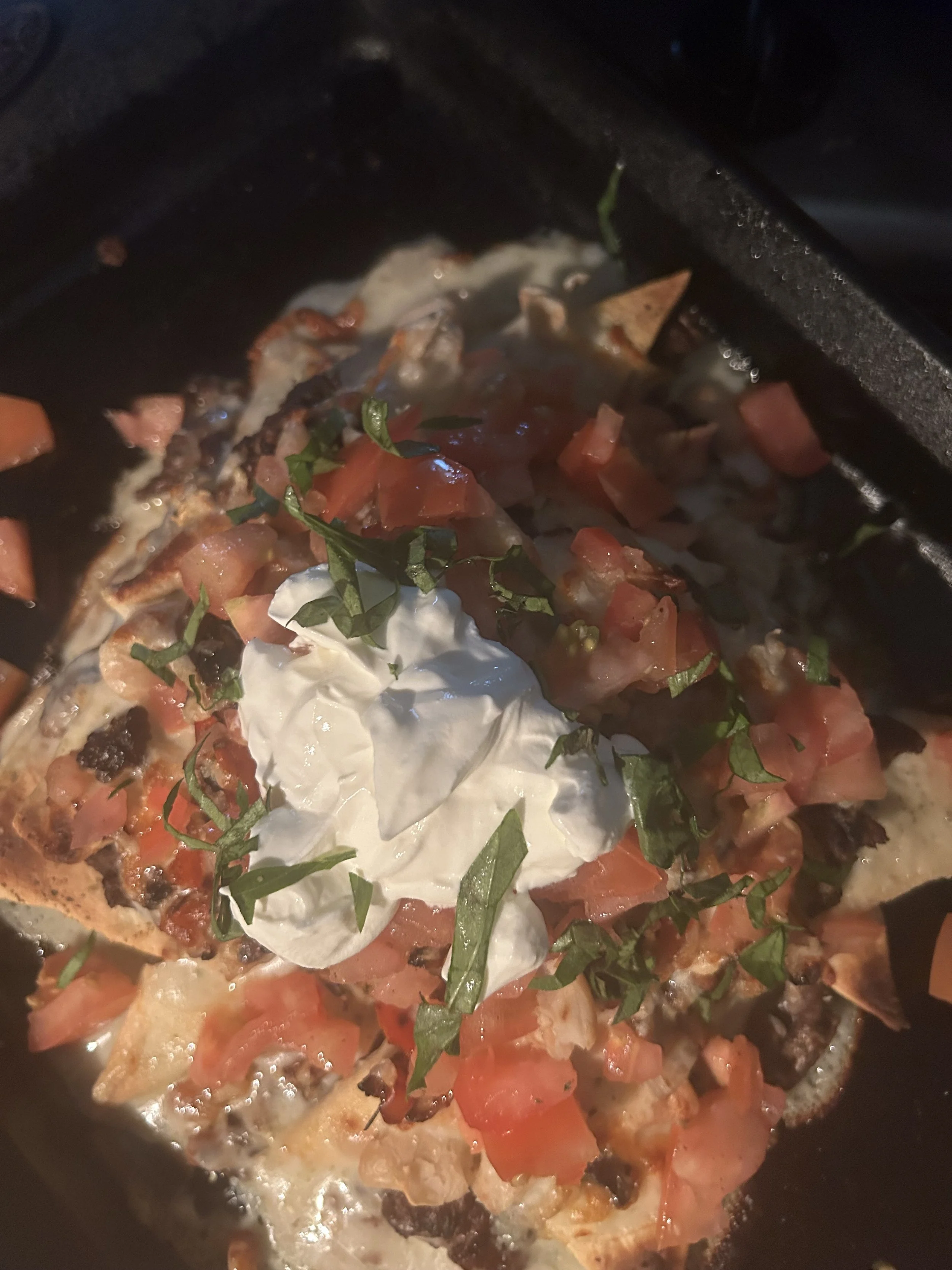 Carefully slide the nachos onto a plate or serving platter, then top with the tomato mixture, sour cream, and a sprinkle of basil.