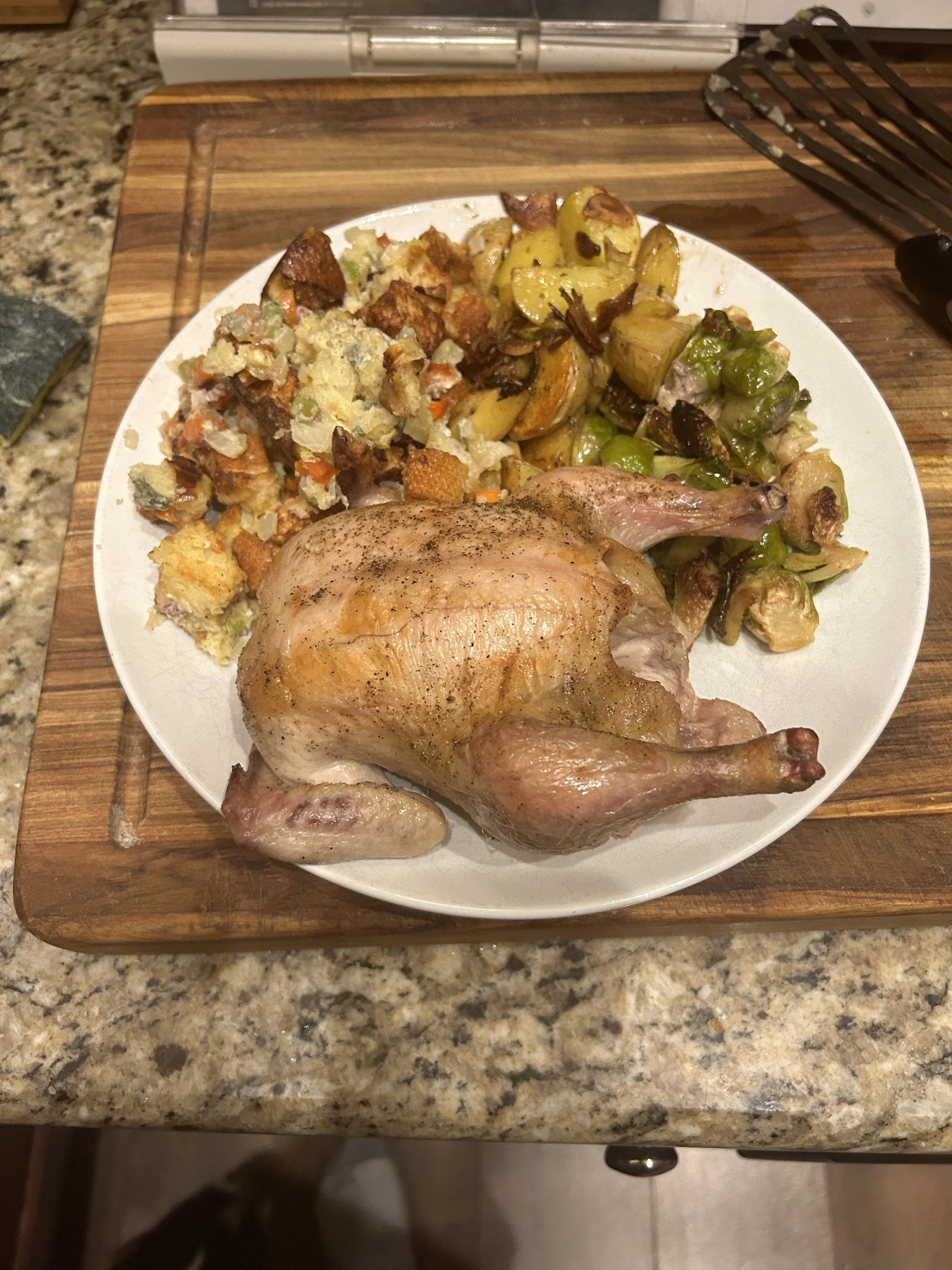 Place the entire sheet pan into the oven and roast everything for 50-60 minutes, or until the Cornish hen reaches a minimal internal temperature of 165 degrees. You may need to toss the stuffing, potatoes and sprouts about halfway through.
