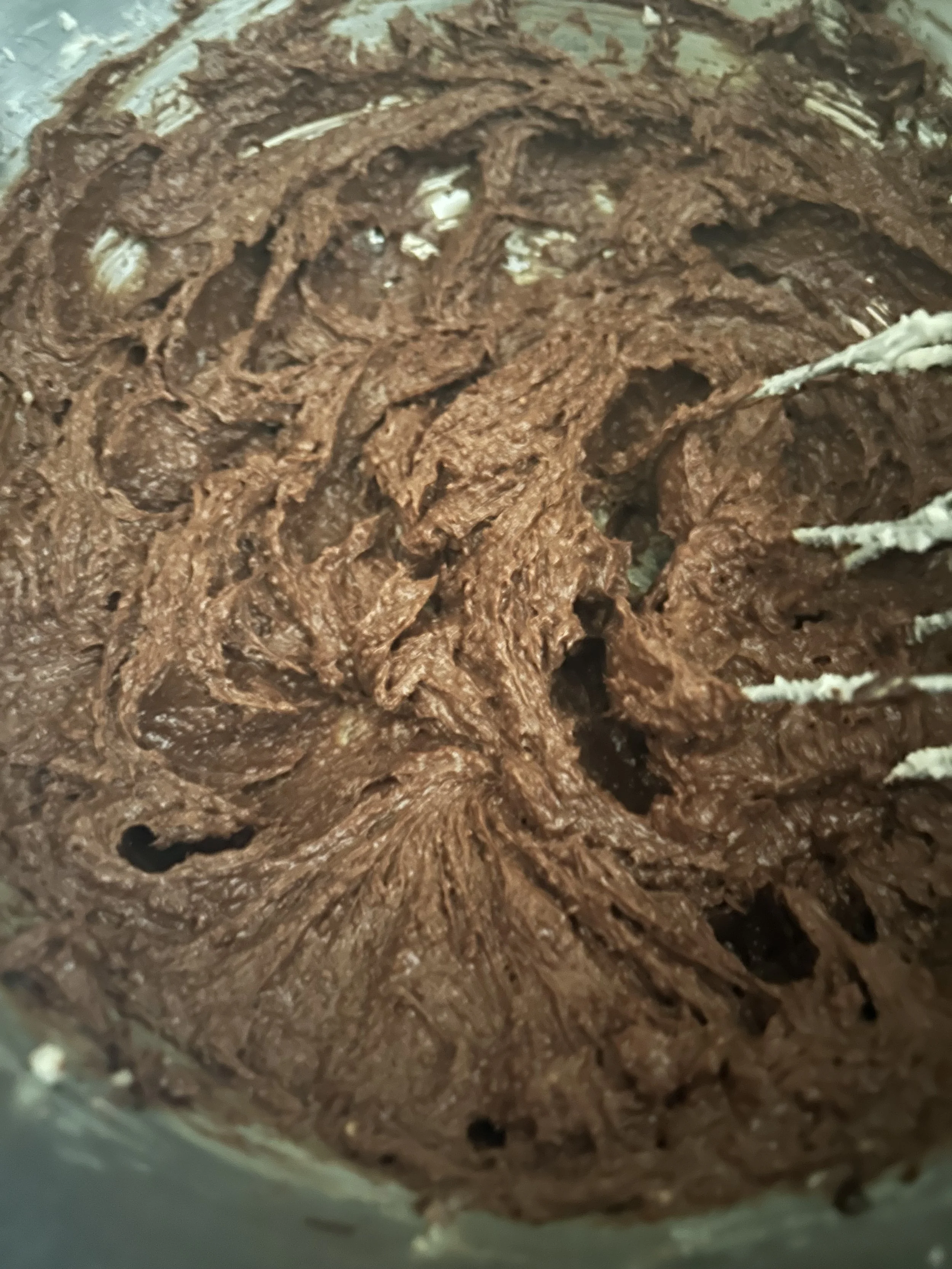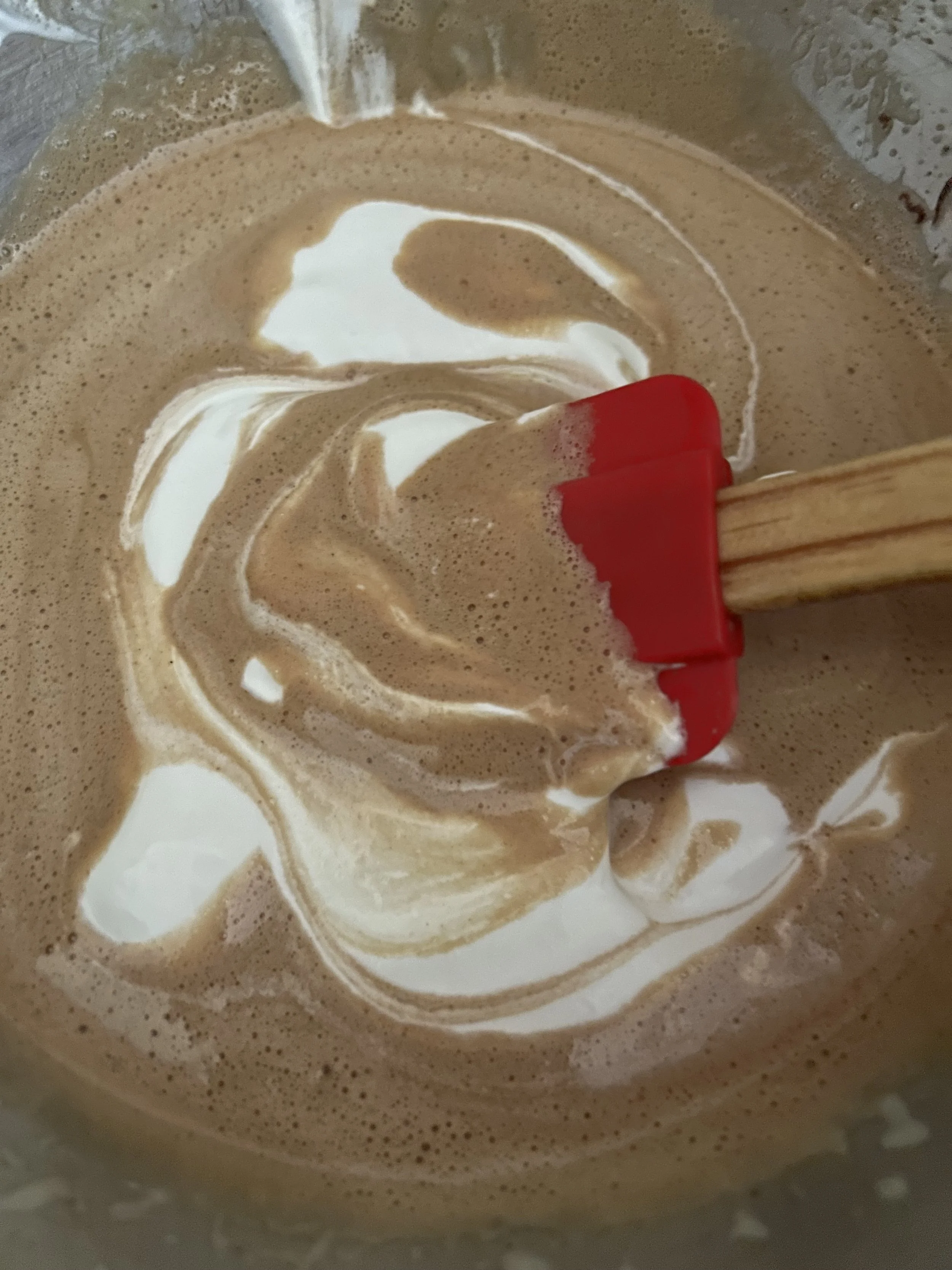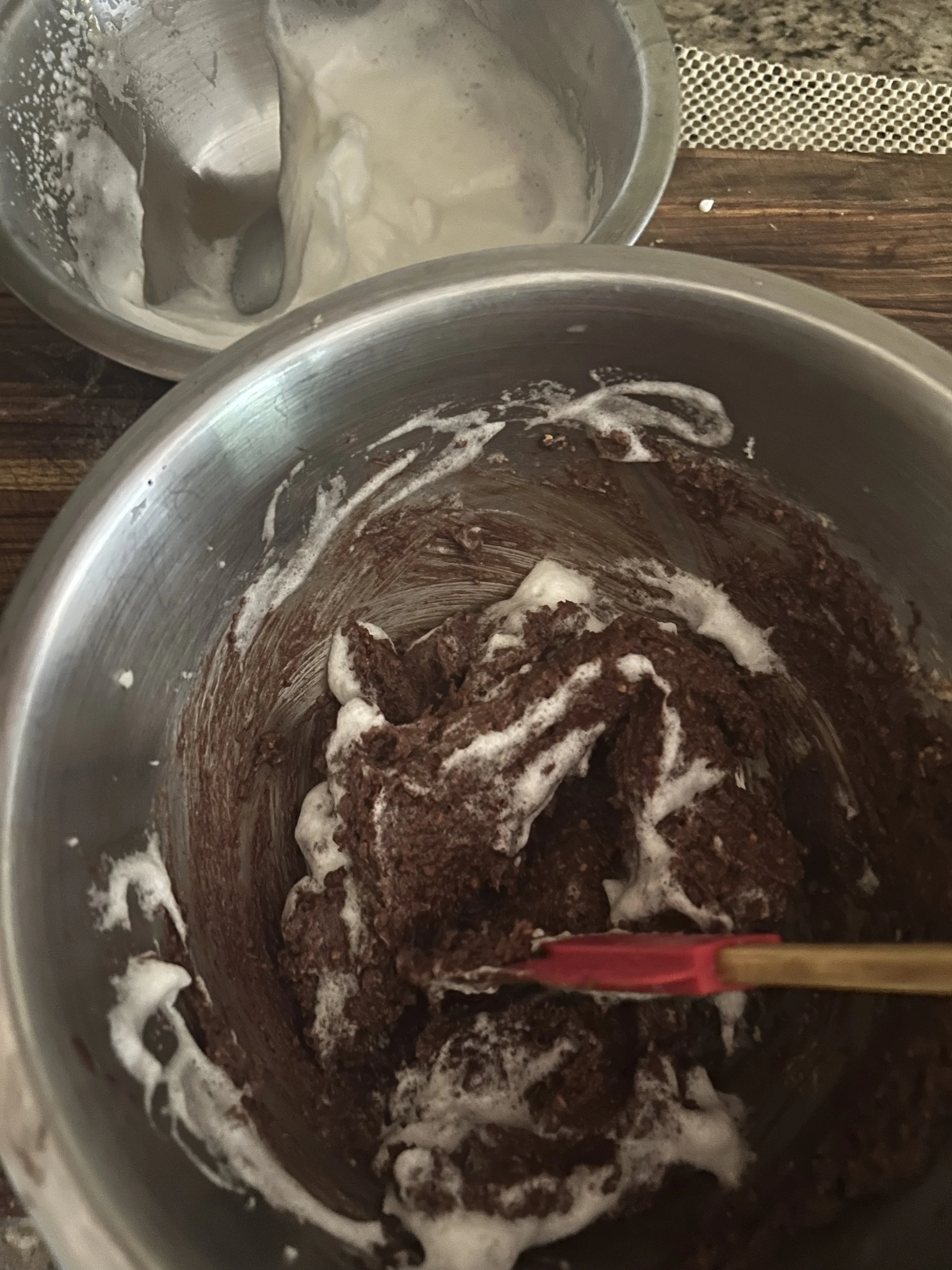 Turn the mixer off, then fold in the whipped cream until fully combined, it should look more like loose chocolate mousse.