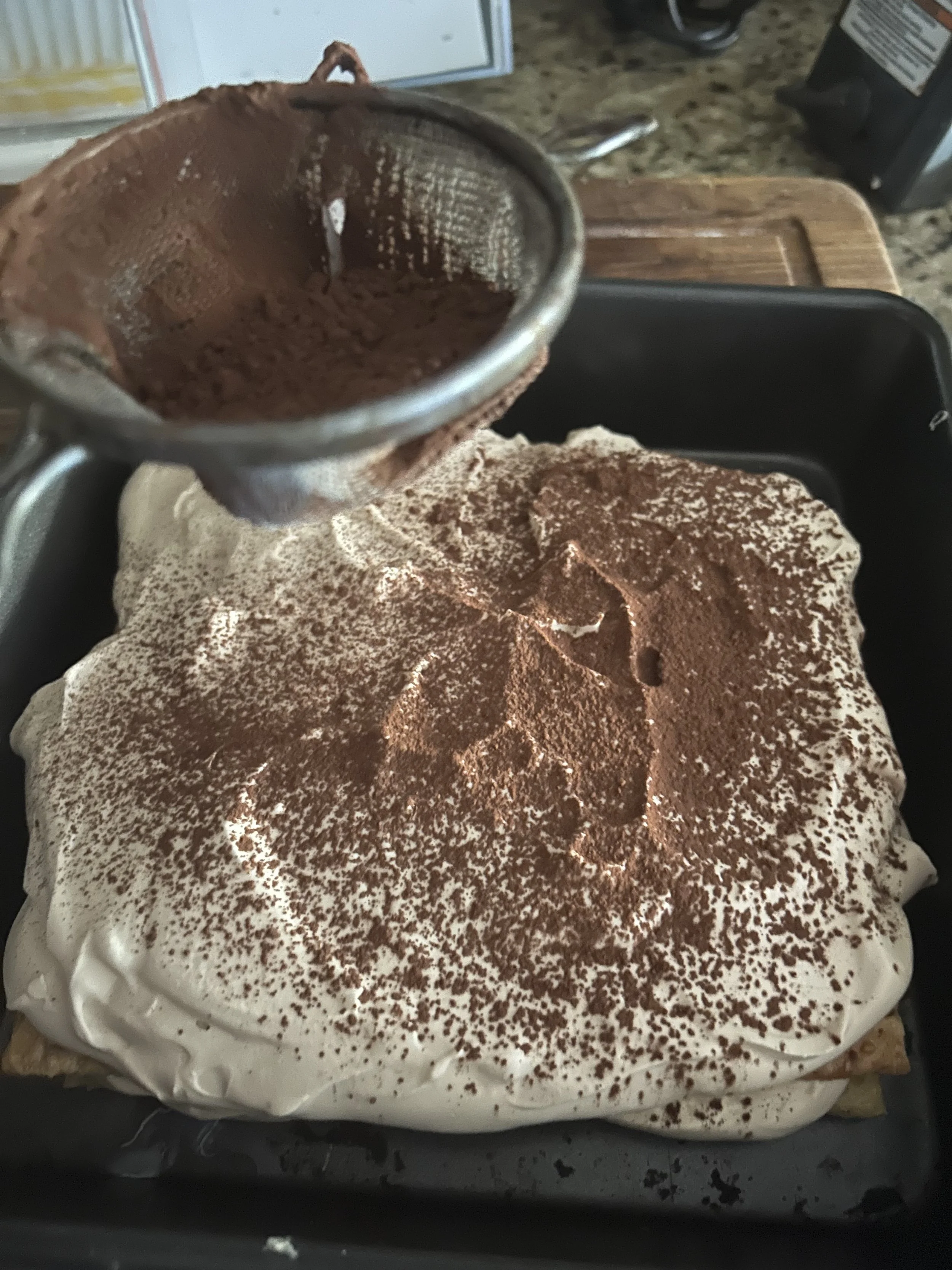 Top with half of the whipped cream mixture, smoothing it out as best as you can, then repeat with the remaining pastry, coffee mixture, and cream, arranging the pastry layers in the same direction as the first one. Cover the dish and chill for at least 4 hours, or overnight.