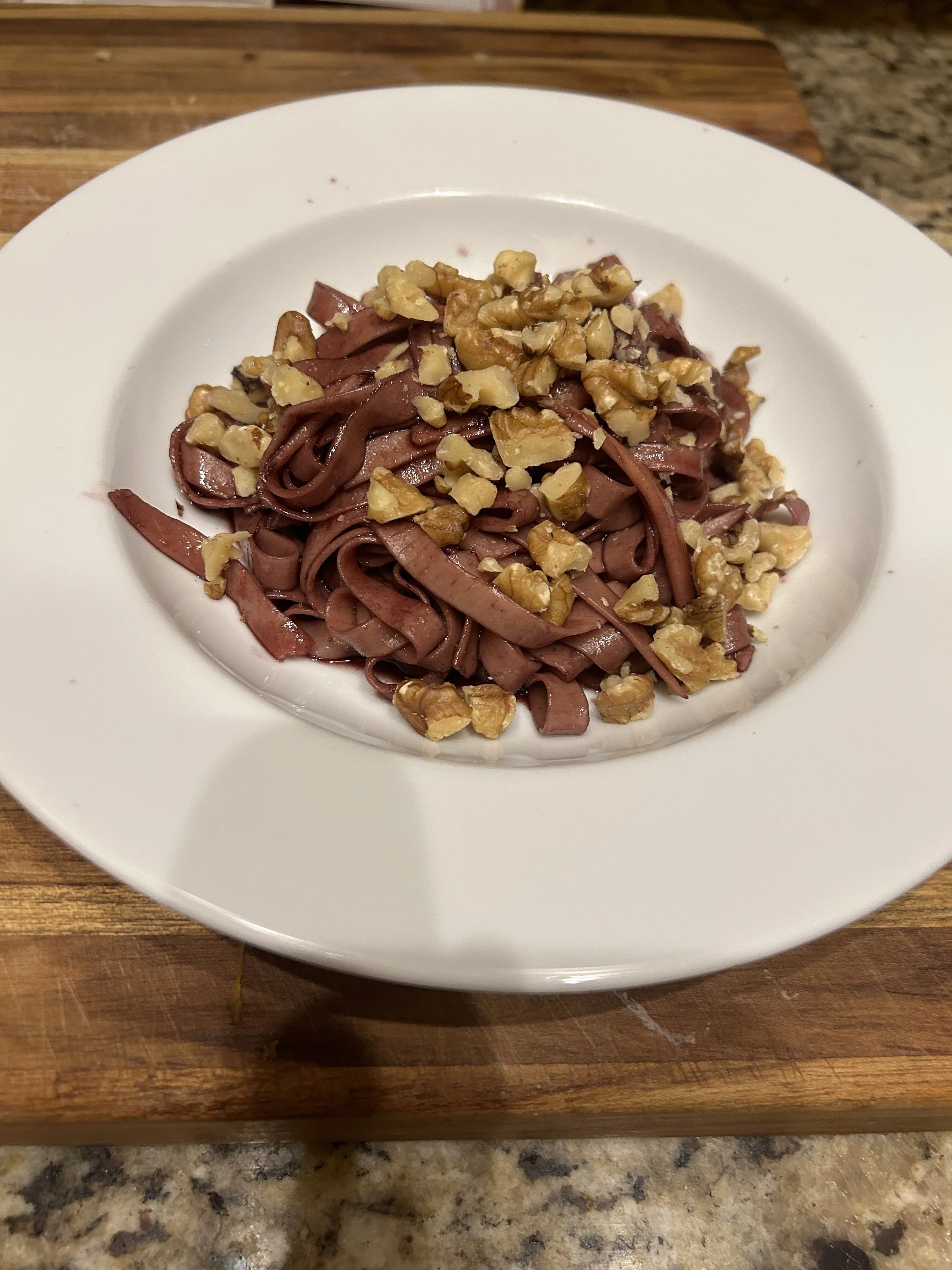 This dish of tagliatelle with reduced sweet wine and walnuts comes from a time in Italian history when sugar was wildly expensive and only the rich could afford the sweet indulgence, so the more common/poor folks had to come up with ways to add sweetness to their dishes, and one of the ways they did that was with fruit or fruit-flavored products.