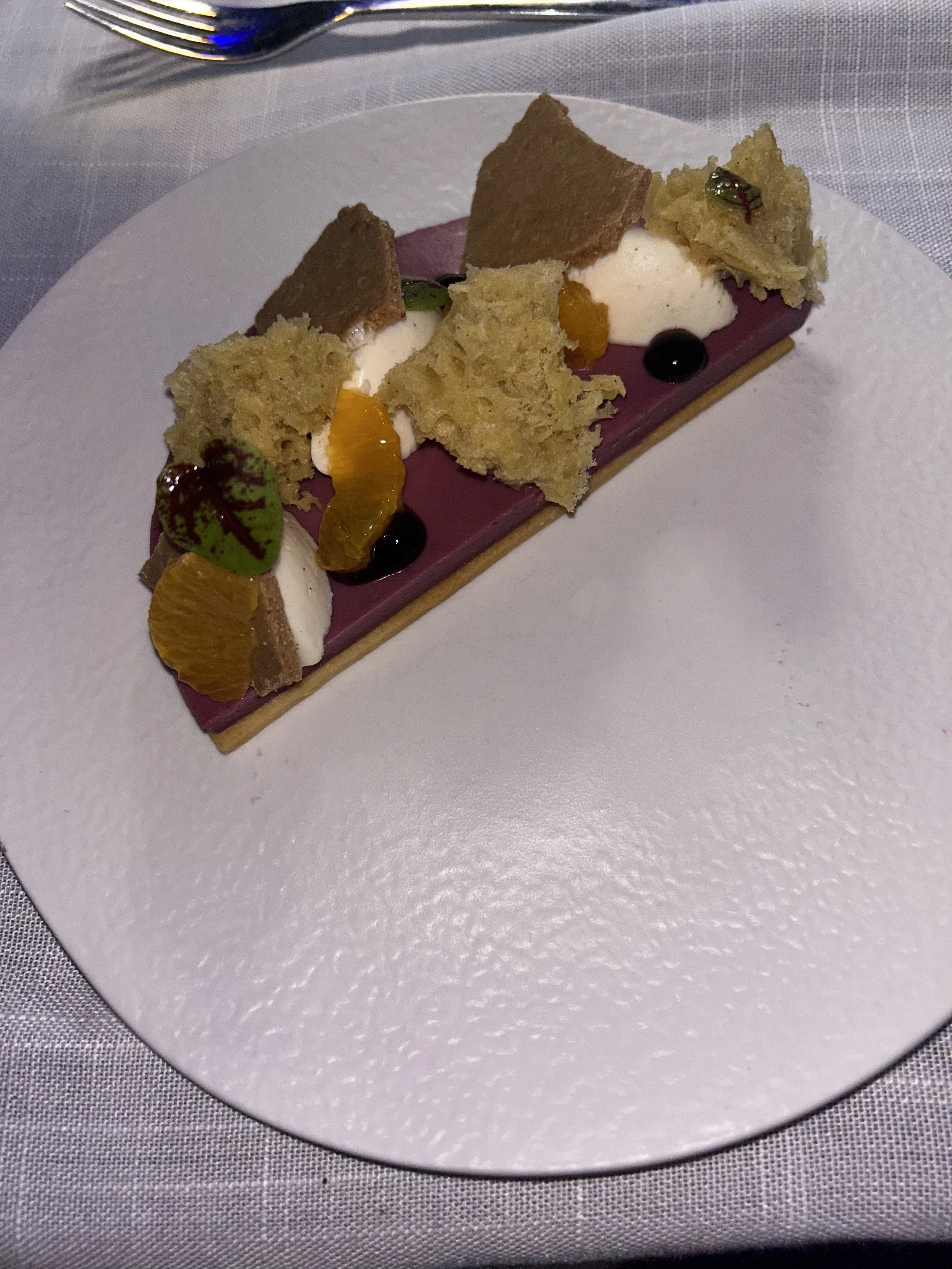Of course, every great dinner has to end with dessert, in this case, it was a black cherry panna cotta sitting on a crisp shortbread base, mascarpone bavarois, almond crisp, and a cherry sauce.