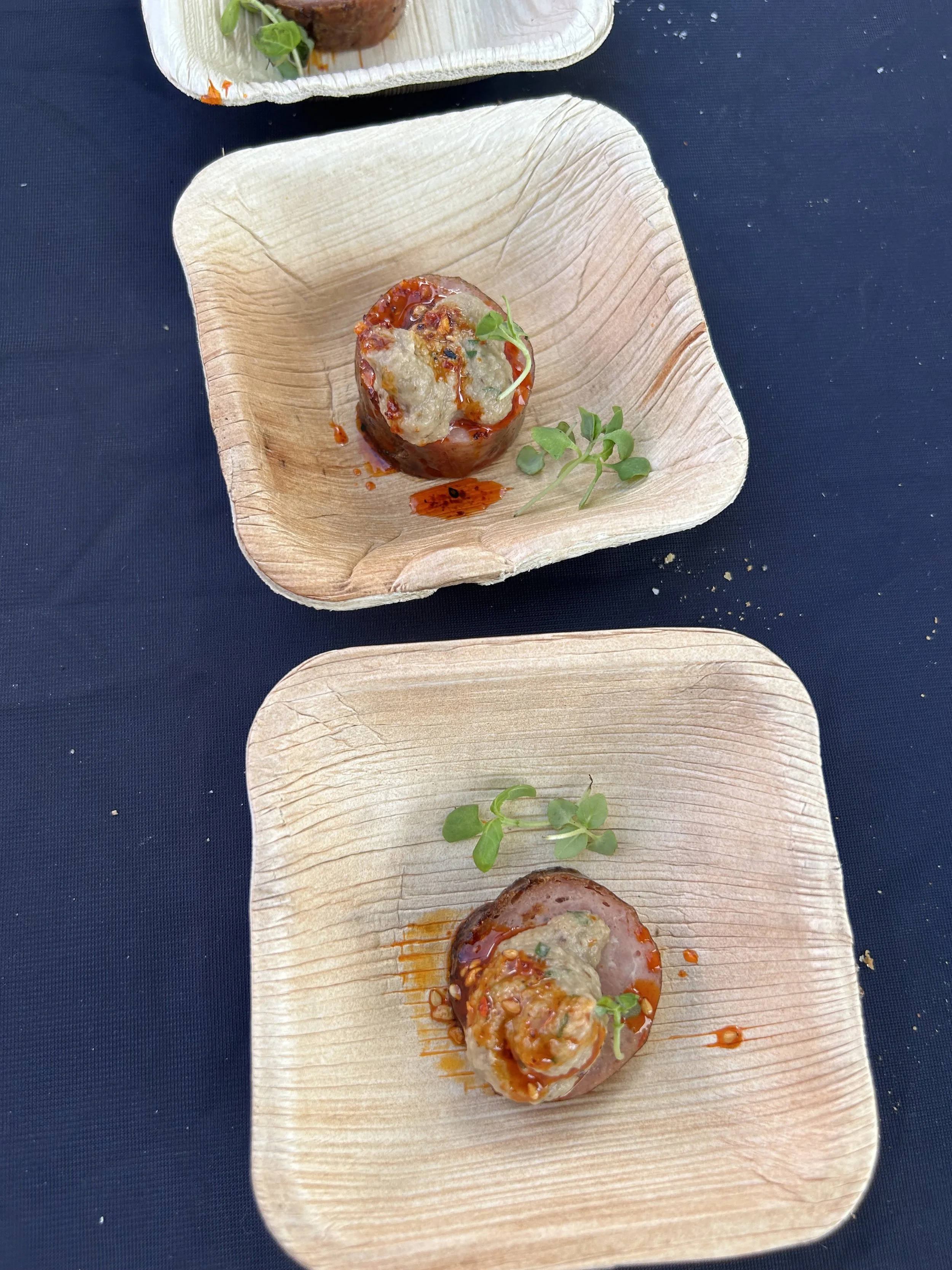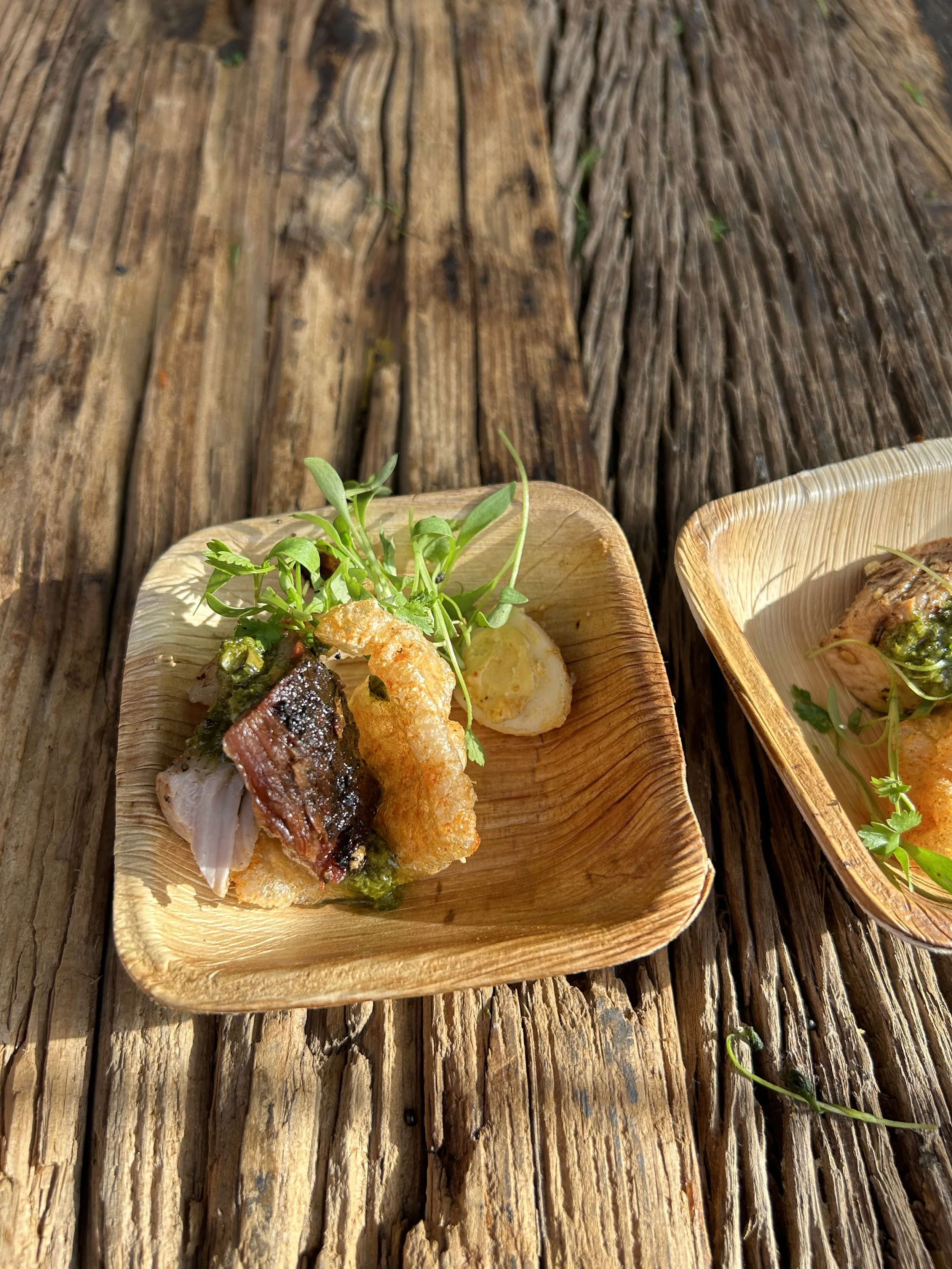 Their bite, or I should say bites, brought a unique Vietnamese spin on a traditional Italian pork roast, porchetta. Chef Will’s porchetta was first charred and treated with a pho-style glaze then served with a chili crunch marinated quail egg, chimichurri, and crispy pig skin.