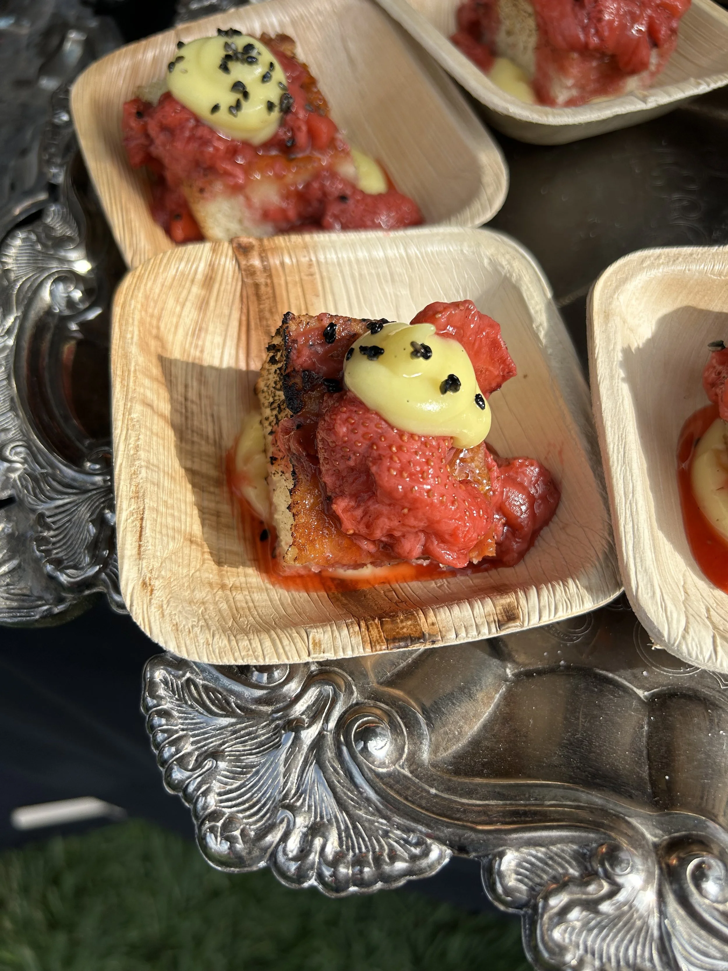 There were two bites to offer, one sweet and one savory. On the sweet side, we have a grilled stone fruit custard with fruity coulis and whipped cream. When blended together, the custard is full of fruity flavor that gets lightened by the cream and makes for a wonderful bite.