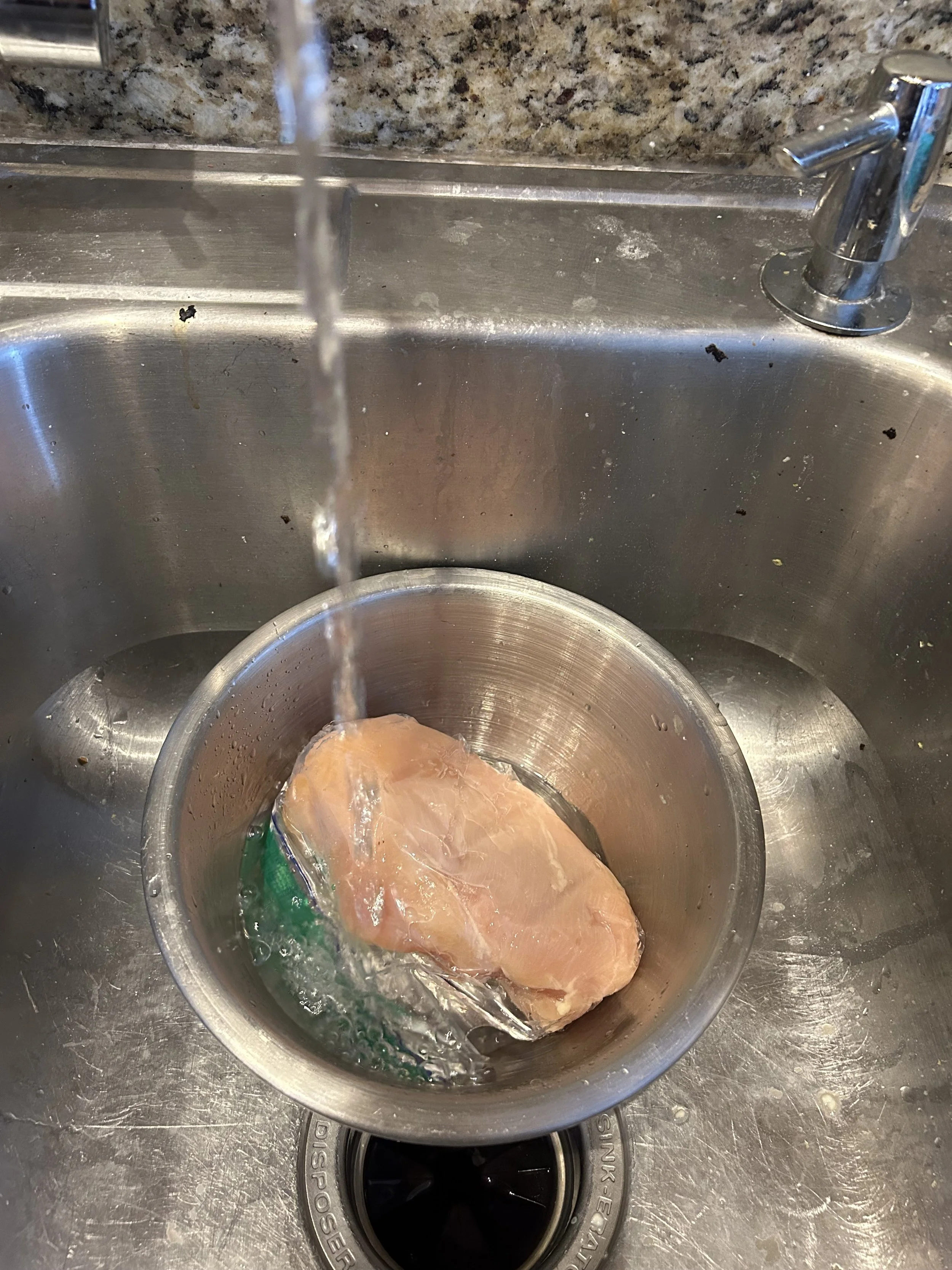 Place the meat you wish to cook into a sealable plastic bag and place it into a bowl or container large enough to hold it. Place the bowl into the sink, then run the meat under cold, running water and it will be good to go in 2-3 hours.