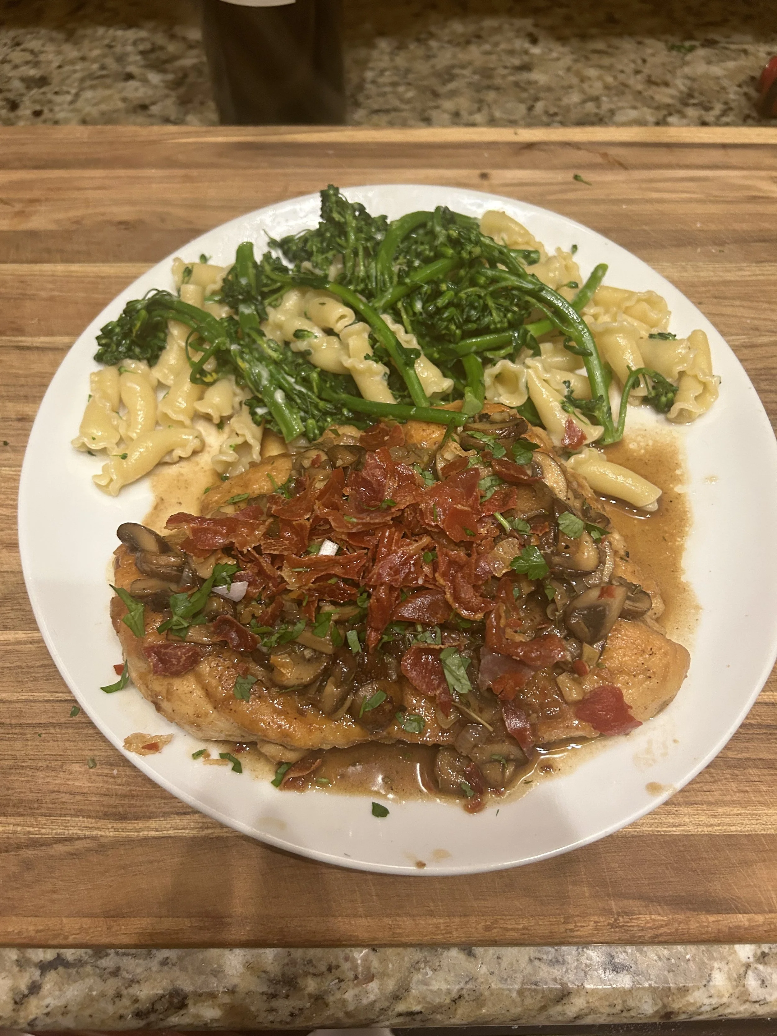 A classic thing to do for chicken marsala is to use a cured pork product. Pancetta is classic, but I like crisping up thin slices of prosciutto that I’ll crumble on top of my chicken for some crispy bits.