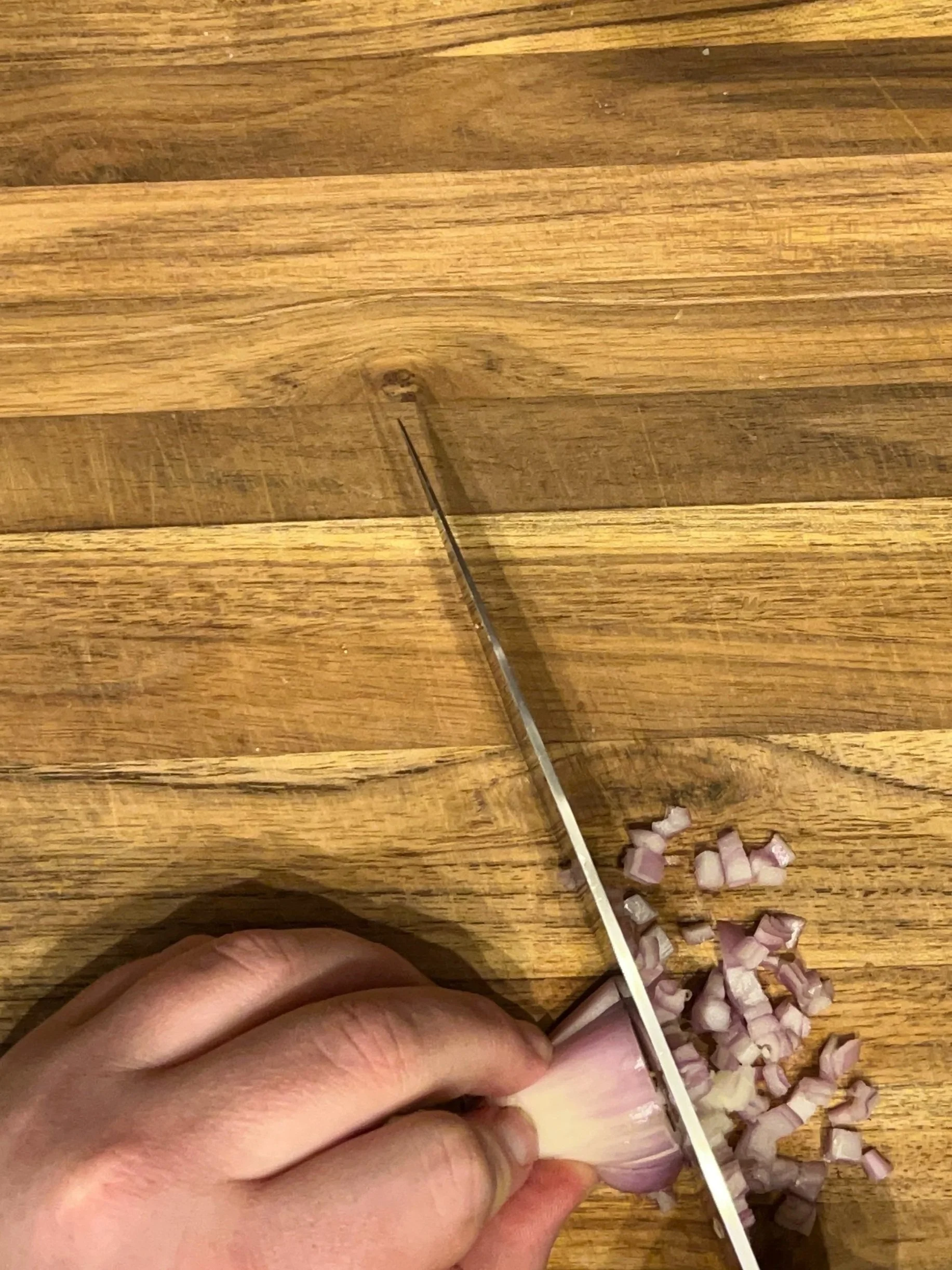 For shallots, I treat them the same way I treat a larger onion. I’ll cut off the top, cut them in half, and take off the papery skin. From there, I’ll make one or two horizontal cuts into the shallot before turning it, making thin, vertical cuts along the width of the shallot and finishing by slicing across into a nice mince.