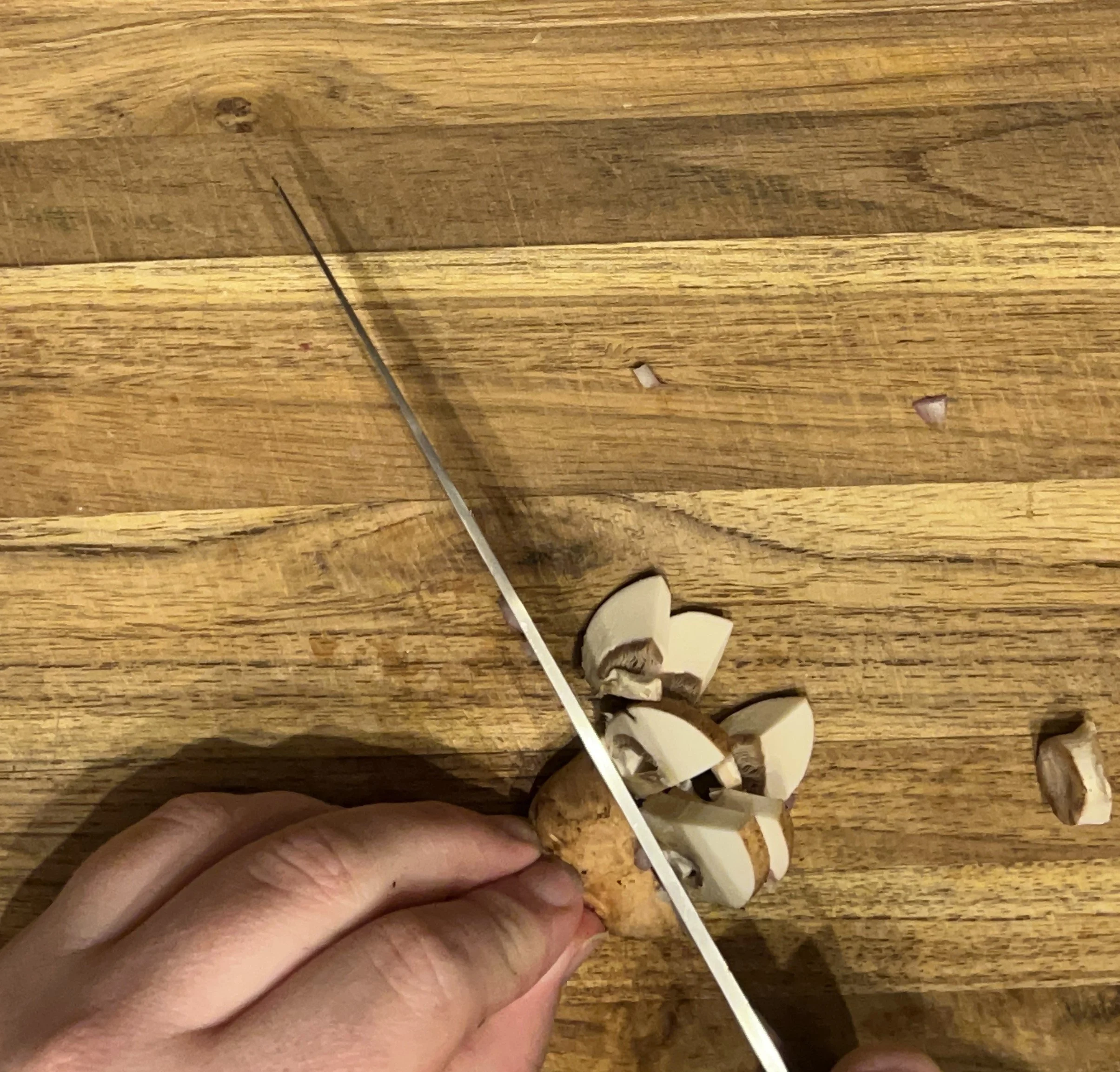 For mushrooms, I’ll cut off the dirty stem end before cutting the mushroom in half to create a flat surface, laying it on that side, and slicing it widthwise to make nice slices.