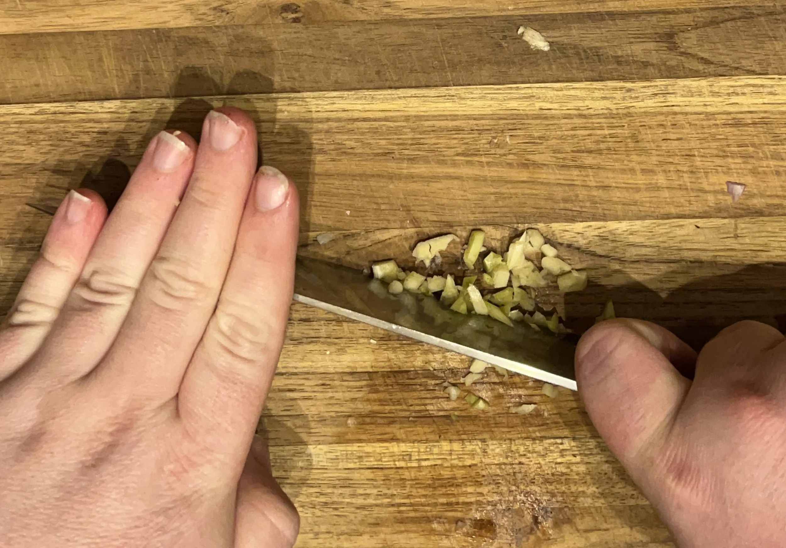 For garlic, I’ll lay the side of my knife on the garlic and give it a light smack to pop off the skin. I’ll then crush the garlic the same way before running my knife along the garlic in a rocking pattern.