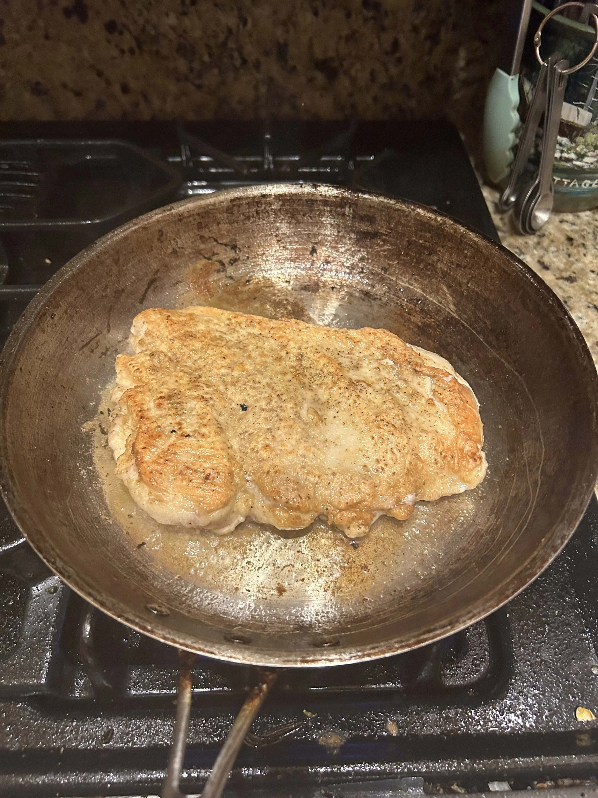 Yes, this is not a nonstick pan, and I am fine with this. To create a pan sauce, you need sticky-brown bits from searing the chicken and you do not get that with nonstick.