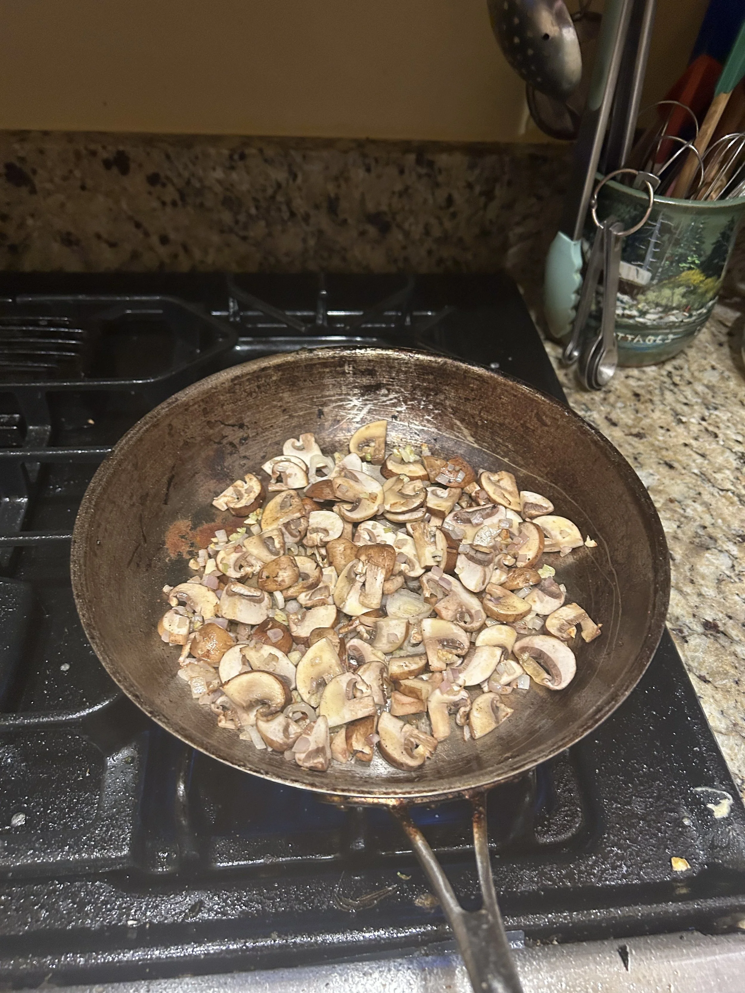 In this case, we will be using shallots, garlic, and mushrooms. Cremini or baby bellas are classic for this, but you can use any mushrooms that you have on hand.