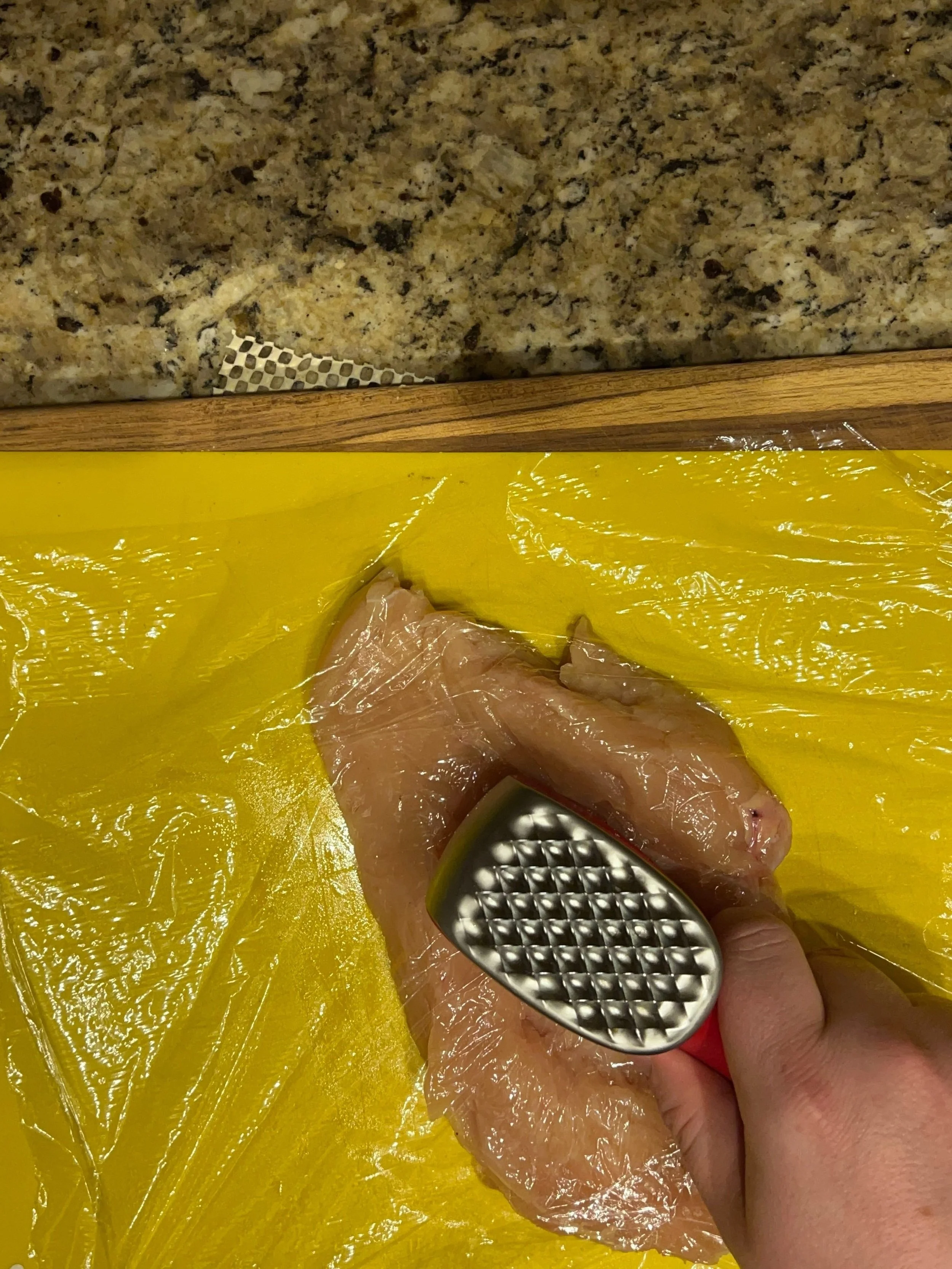 From there, lay a sheet of plastic wrap on top of the chicken and use a meat mallet to pound the chicken into an even thickness. Once all of your chicken has been butterflied, set it aside while you prepare the vegetables.