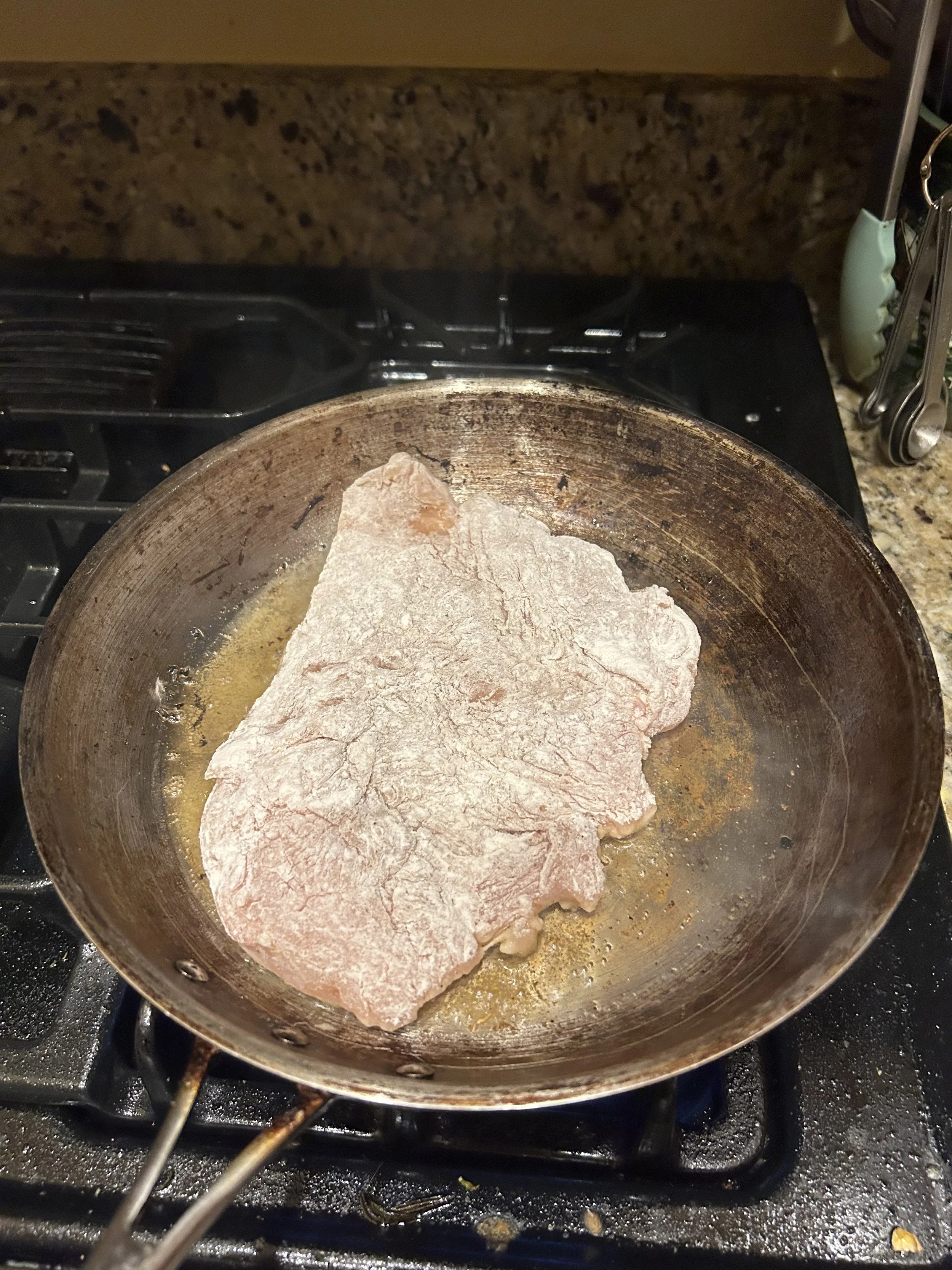 Dredging is a process where we coat a piece of meat, the chicken in this case, in a light dusting of flour. This flour will help the chicken brown nicely and also some of that flour will come off into the pan to help thicken the sauce later on.