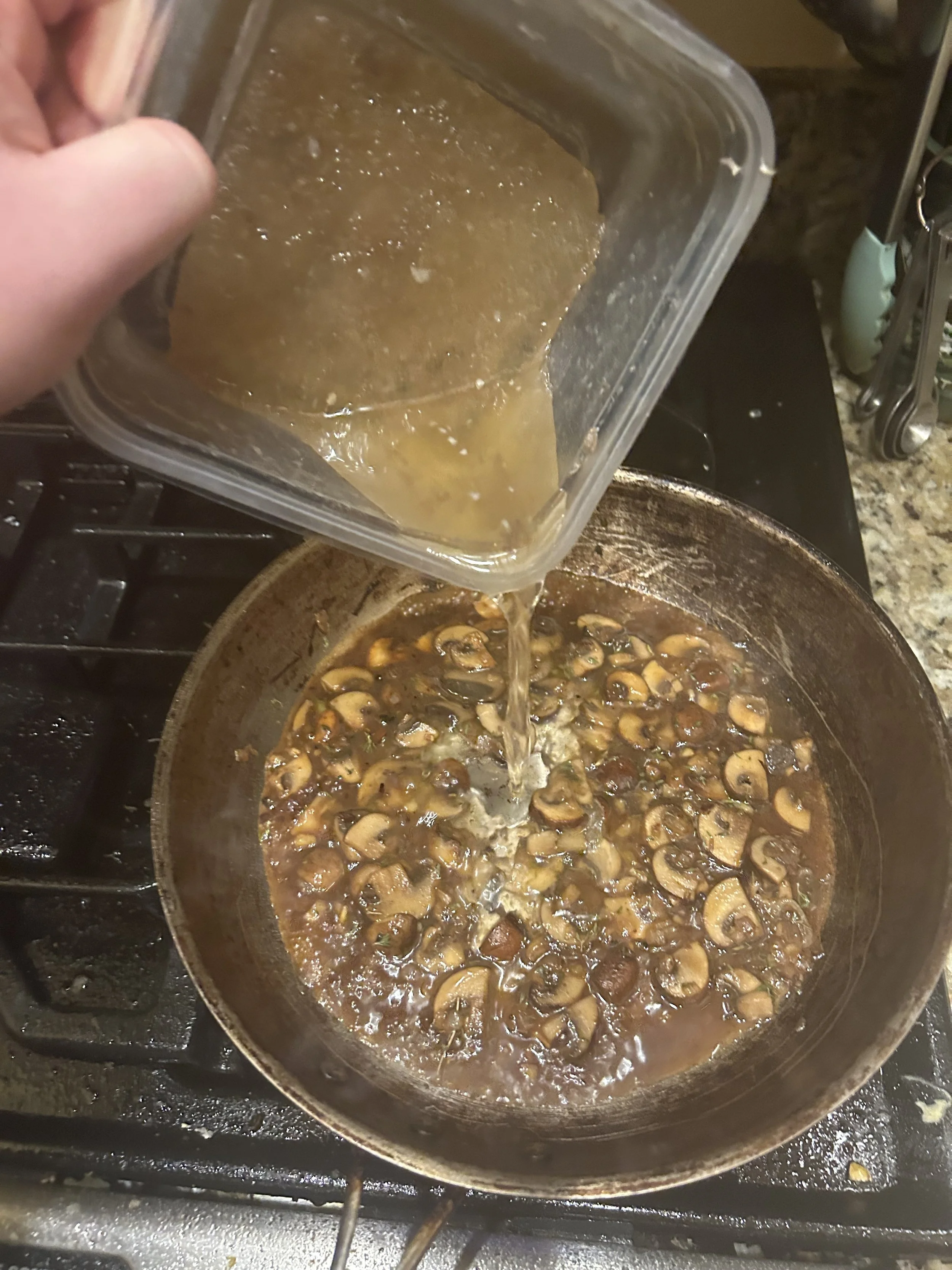 Once your flambe is successful, it is time to add 1 cup of chicken stock to the pan. (I used homemade stock, but low-sodium store-bought broth is fine)