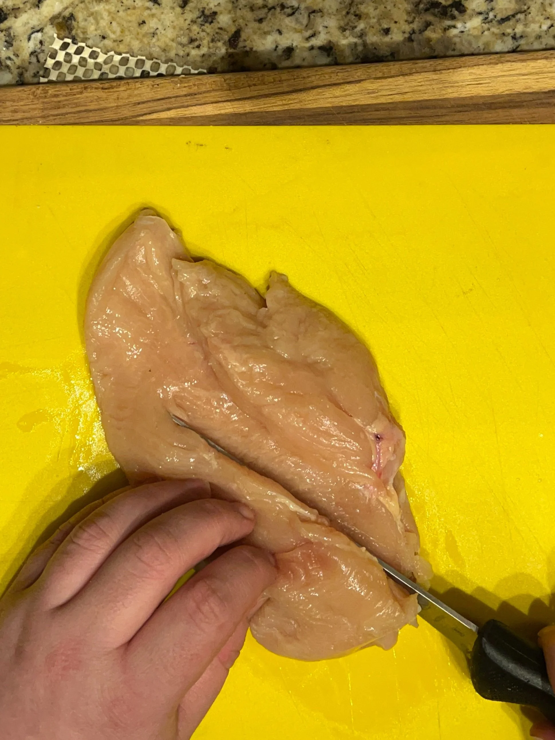 In this case, we are going to cut the thick part of the chicken breast in half so we can pound it thin and allow the chicken to cook quicker, a method known as butterflying.