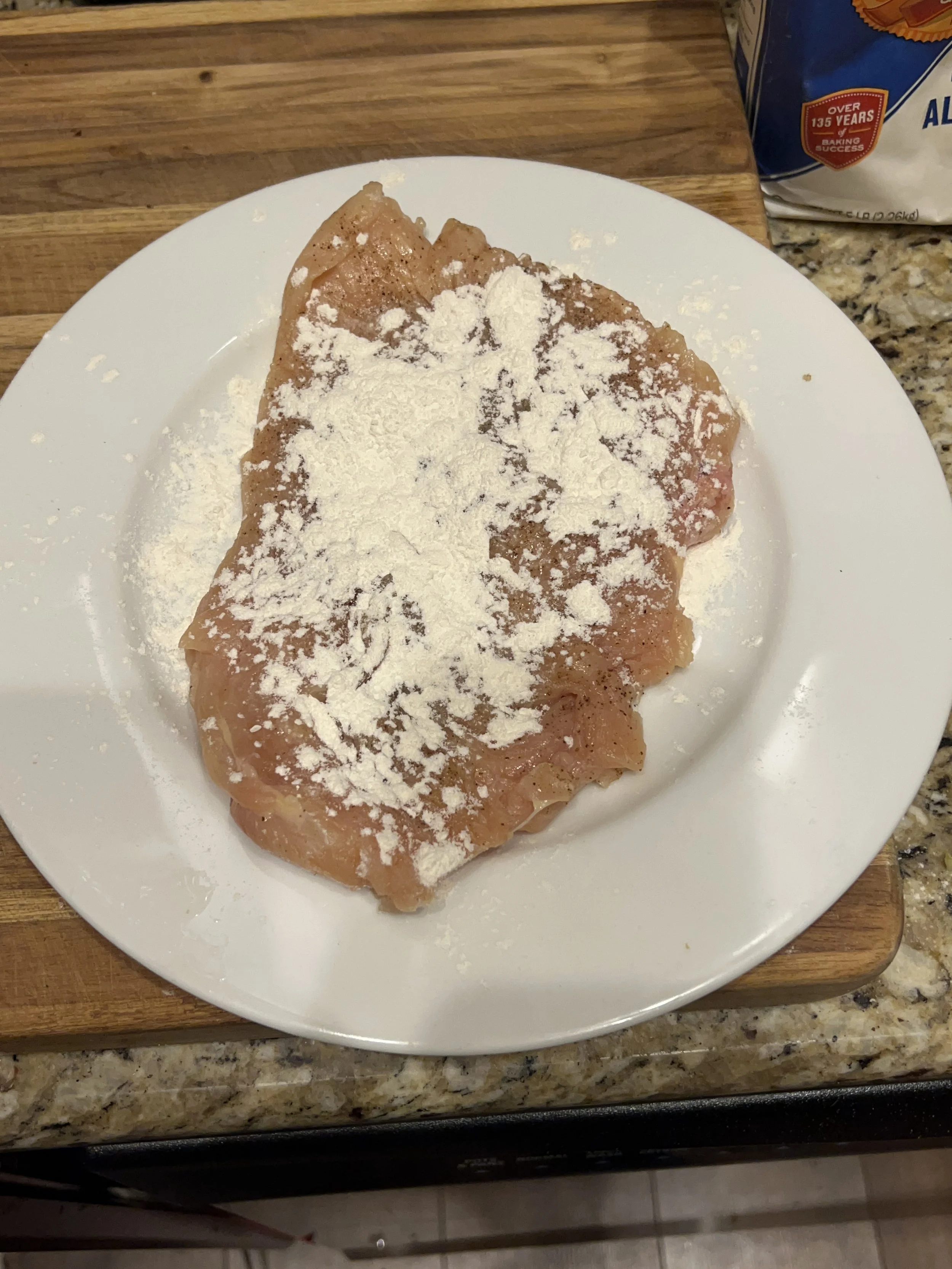 Season all of the chicken on both sides with salt and pepper, then lay each breast into a plate or shallow dish filled with flour and flip to coat, making sure you shake off the excess.