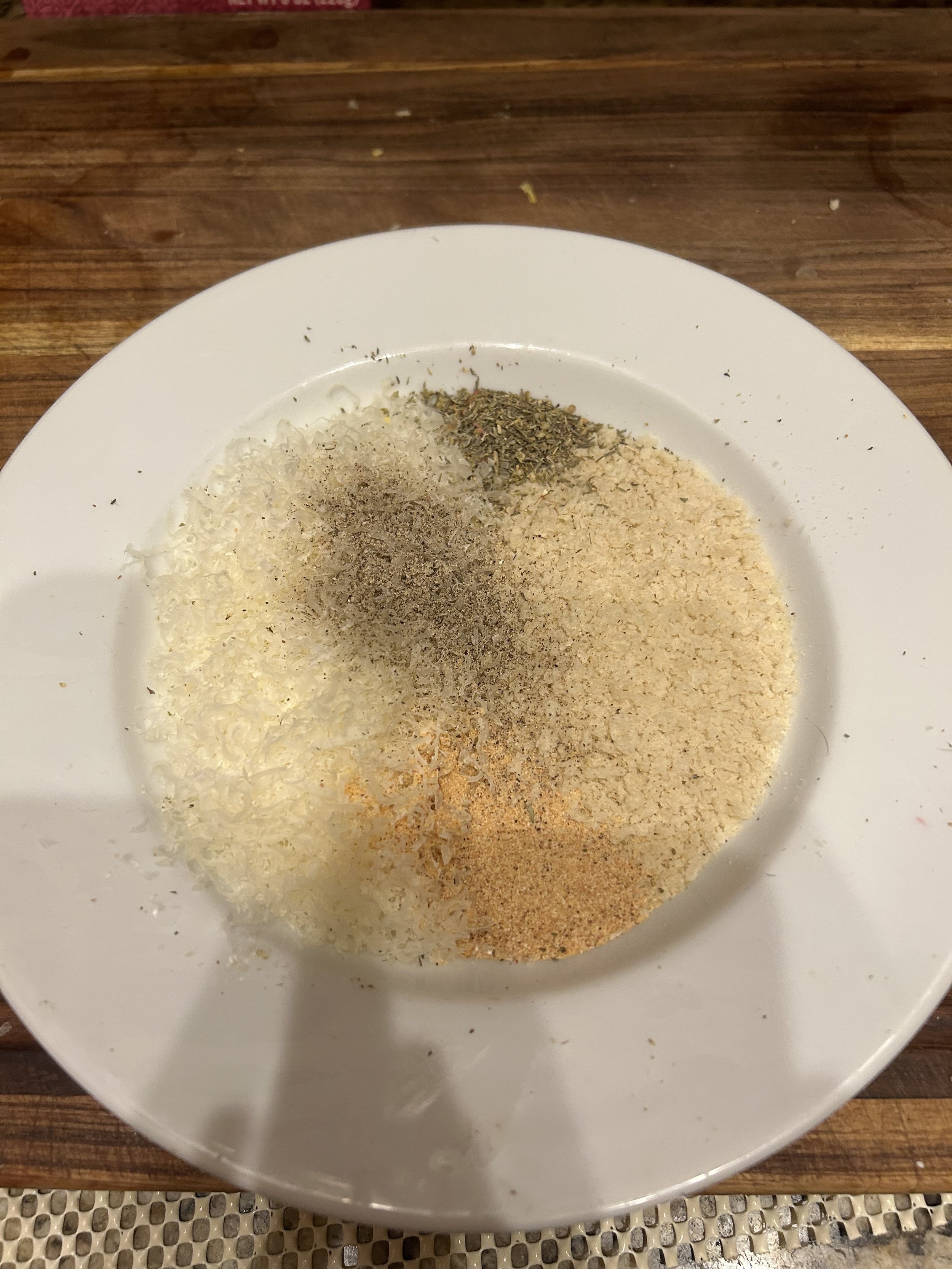 In another bowl, I combine panko breadcrumbs, grated parmesan, garlic powder, Italian seasoning, and fresh ground pepper.