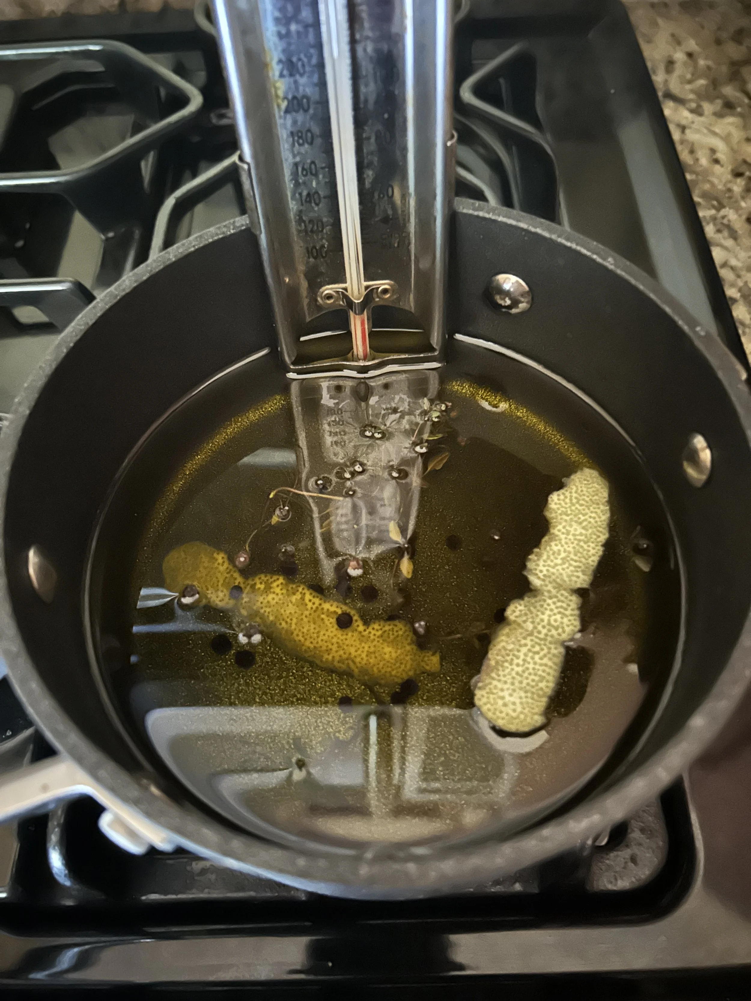 Fill a wide pot with 1 1/2-2 inches of oil and heat to 150 degrees with a fry thermometer, along with the lemon peel, thyme, and peppercorns. (if the oil gets above 150 degrees, then take the pot off the heat for a few minutes.)