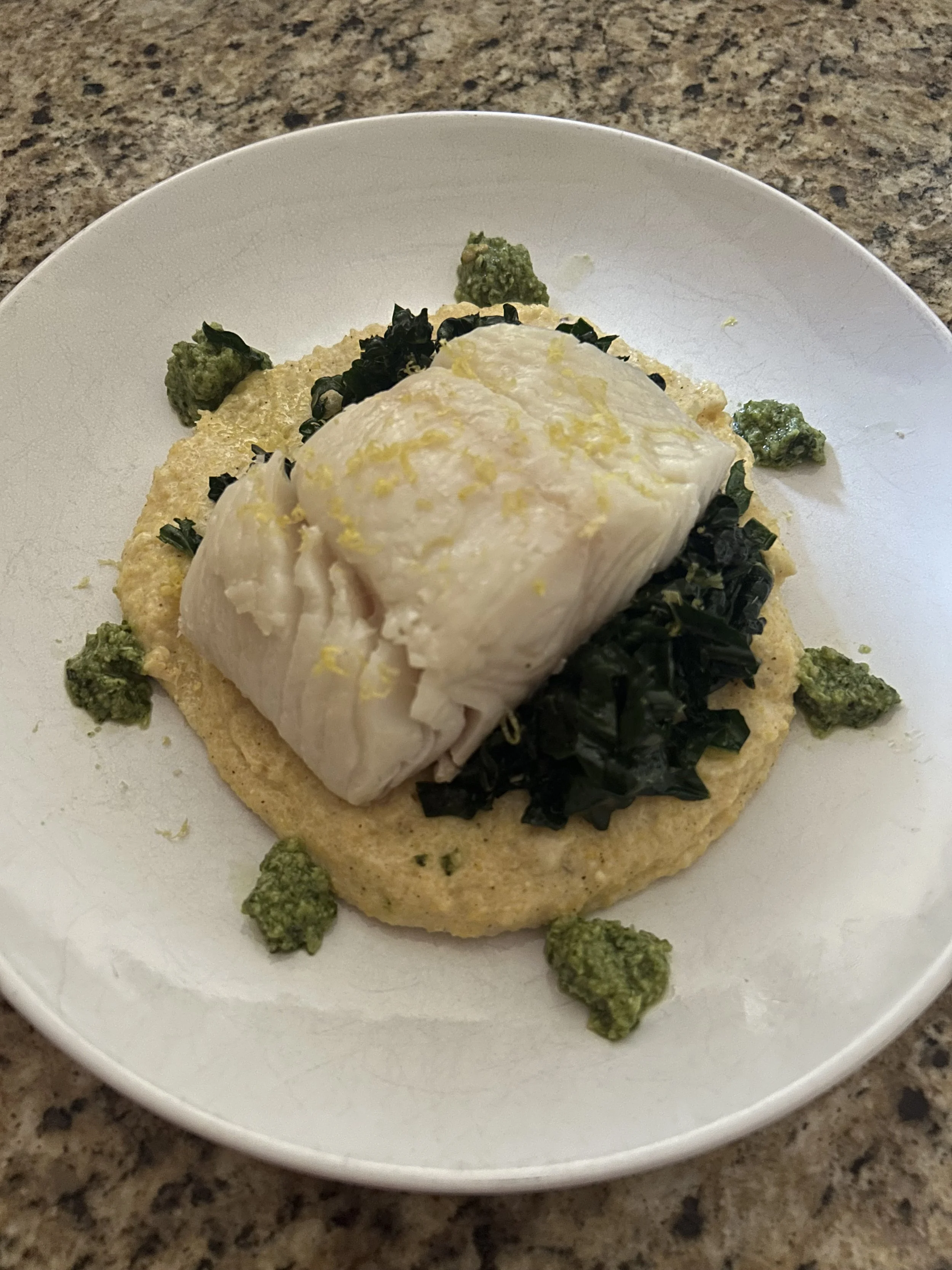 Divide the polenta among 4 plates, top with the kale, a piece of fish, and dot the pesto around the edges of the polenta. Serve with the lemon wedges, and enjoy!