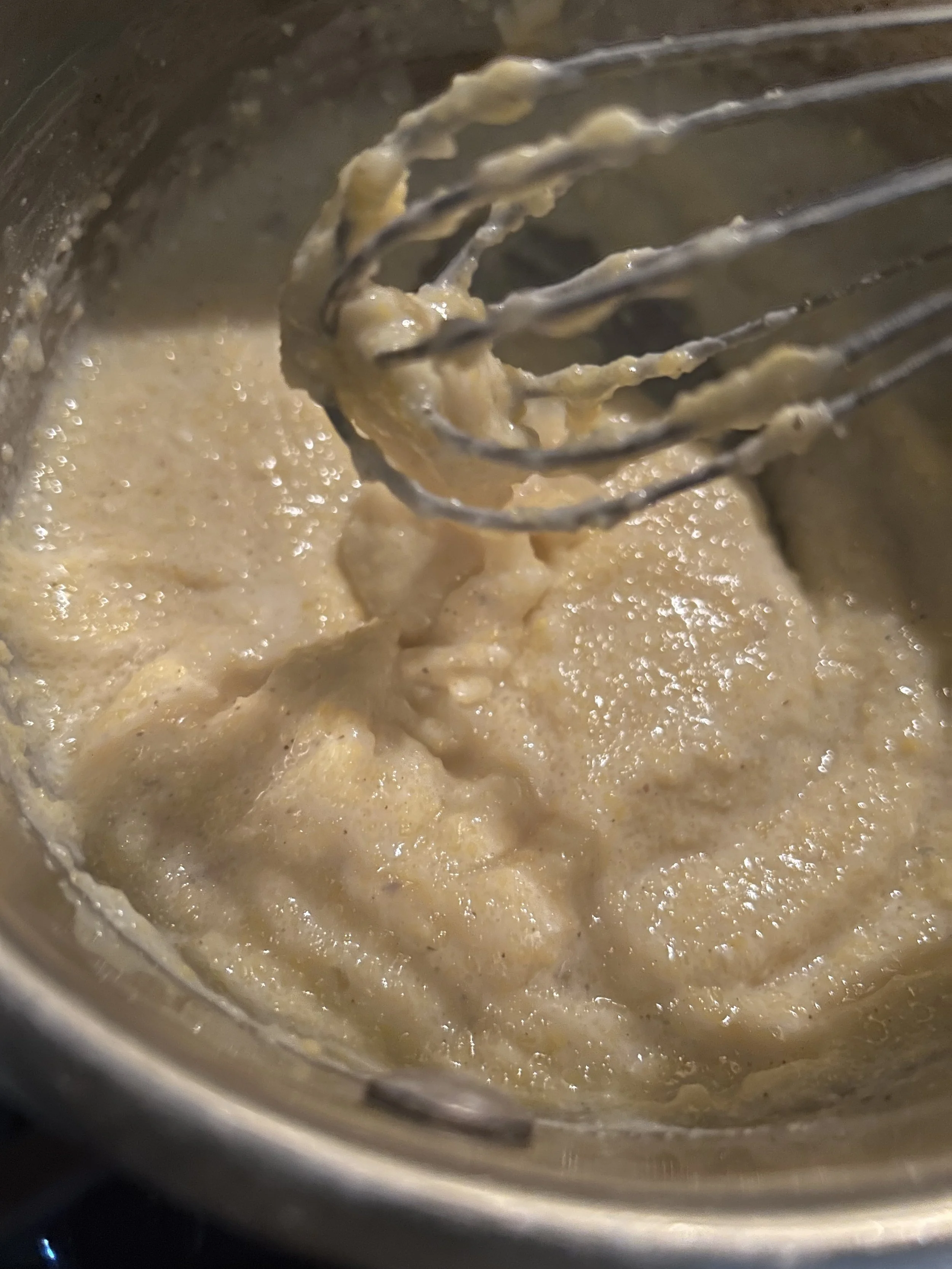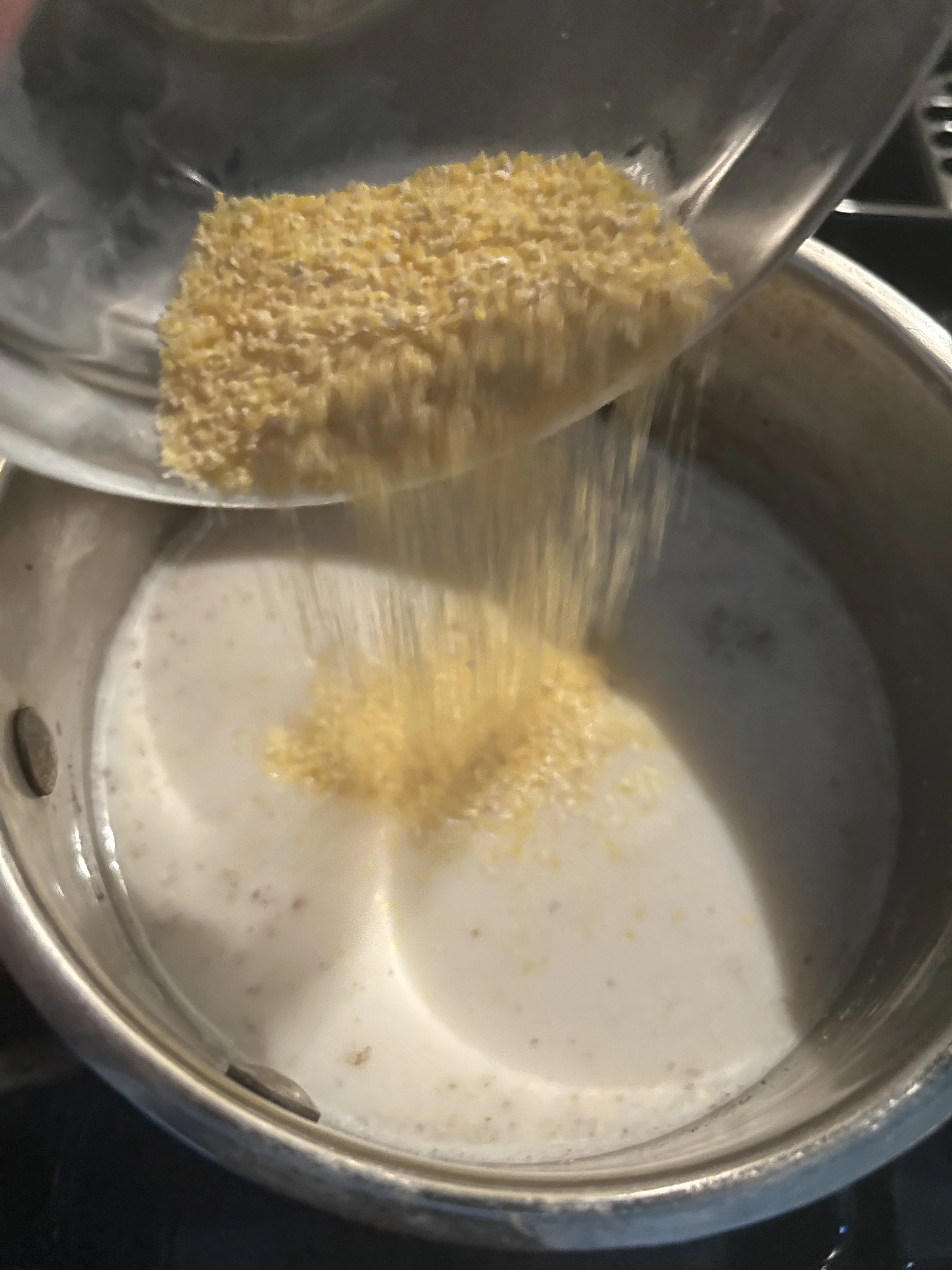Once the liquid was hot but not boiling, I thenI will whisked in 1/4 cup of stone-ground polenta.