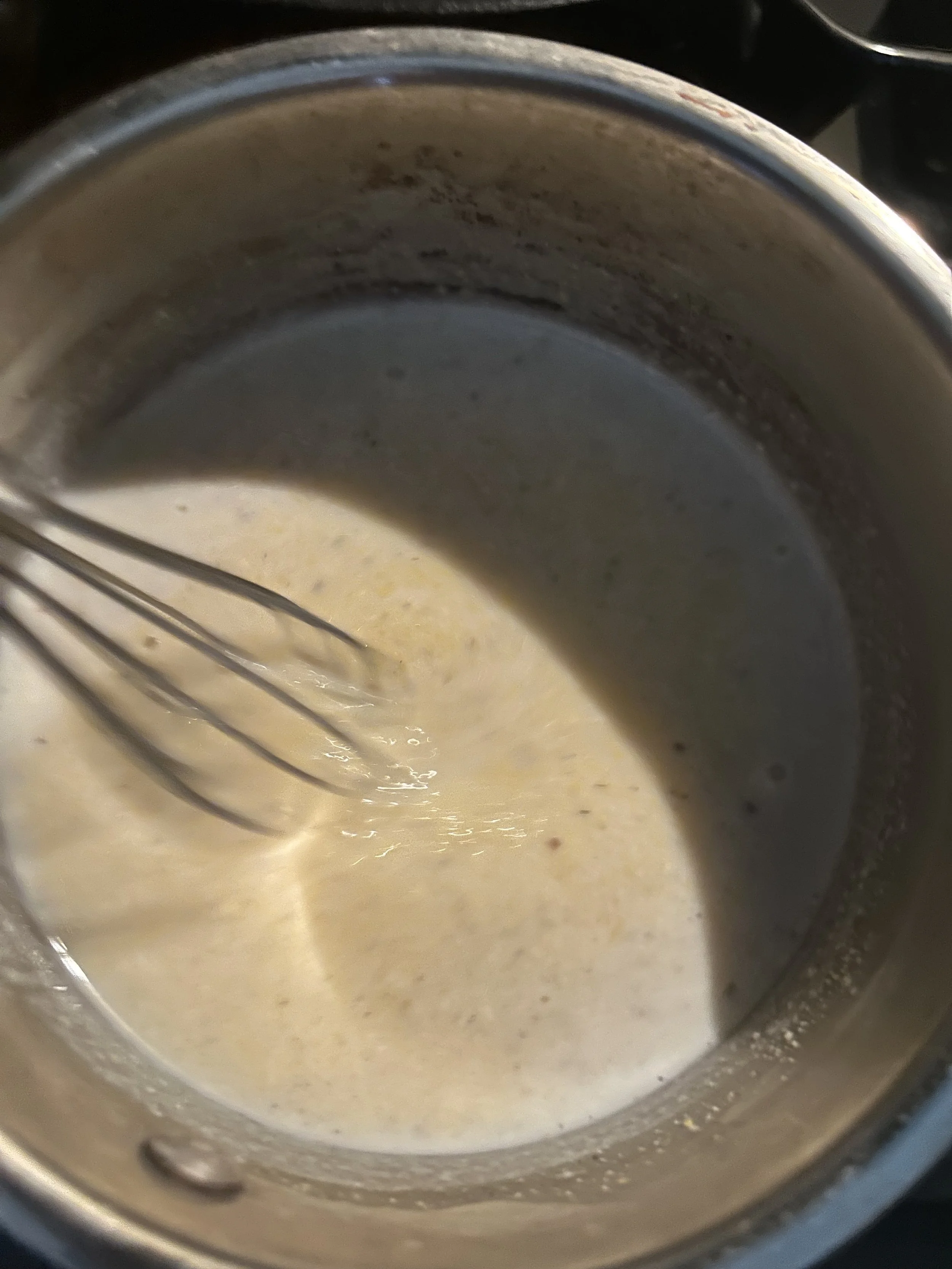 Meanwhile, Bring the milk and 2 cups of water to a simmer in a separate pot. Season with salt and pepper.