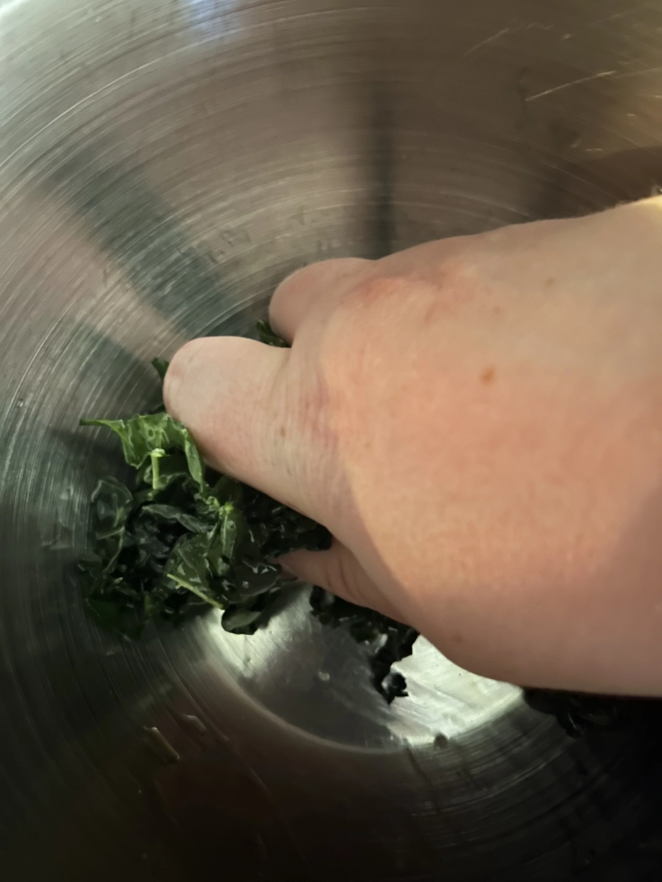 You really do need to give the kale a good massage, about a minute or two of continuous squeezing and rubbing, but it is so worth it! You’ll notice the kale wilt a bit and get a bit darker in color, that’s how you know the oil has penetrated the cell walls of the kale and has made it very tender.
