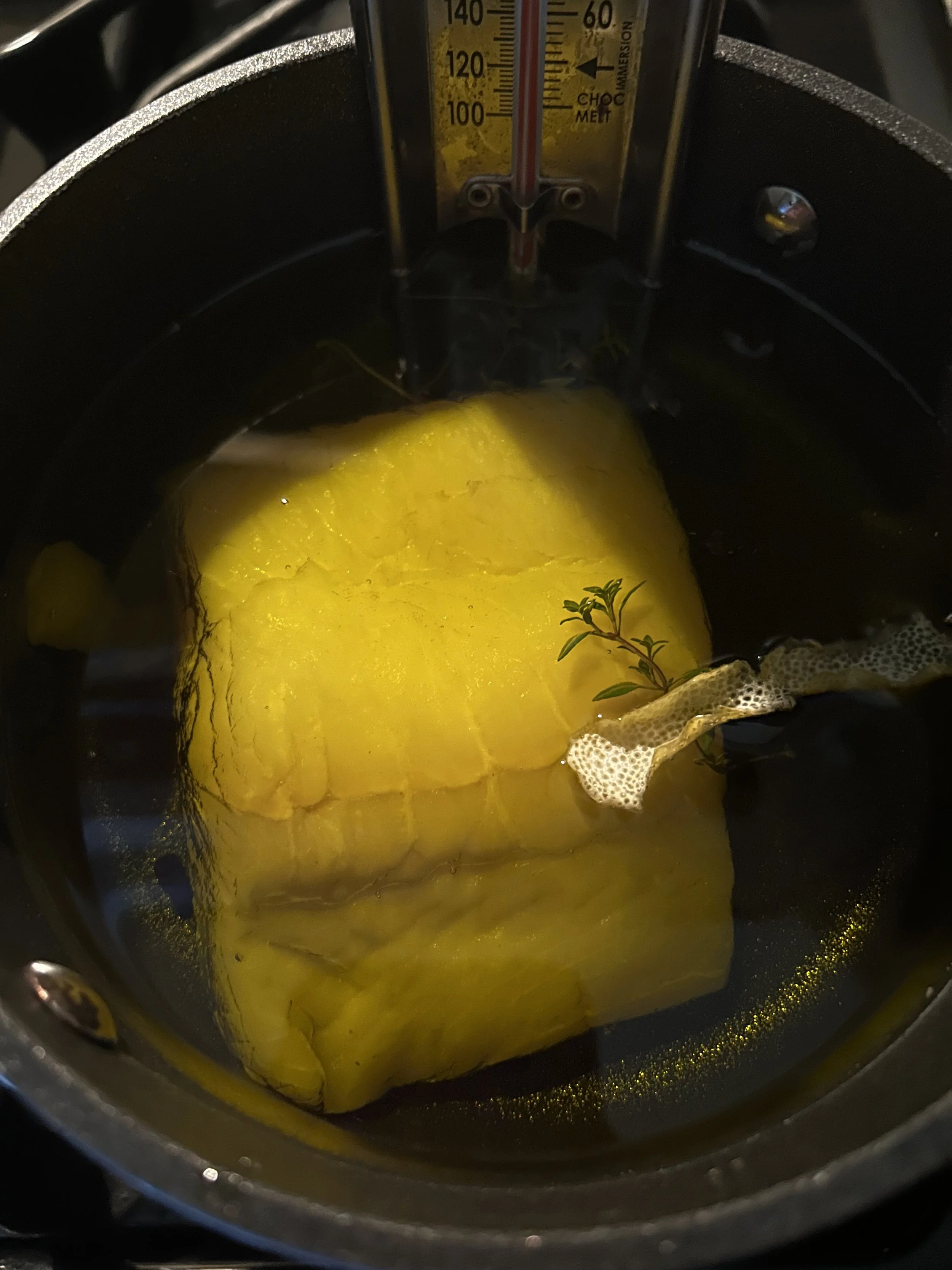 Today, I am going to show you how to do a technical but delicious dish, I am going to be making olive oil poached fish. The idea of poaching fish in olive oil is to slowly cook the fish, get it nice and tender, and infuse it with some great flavor.