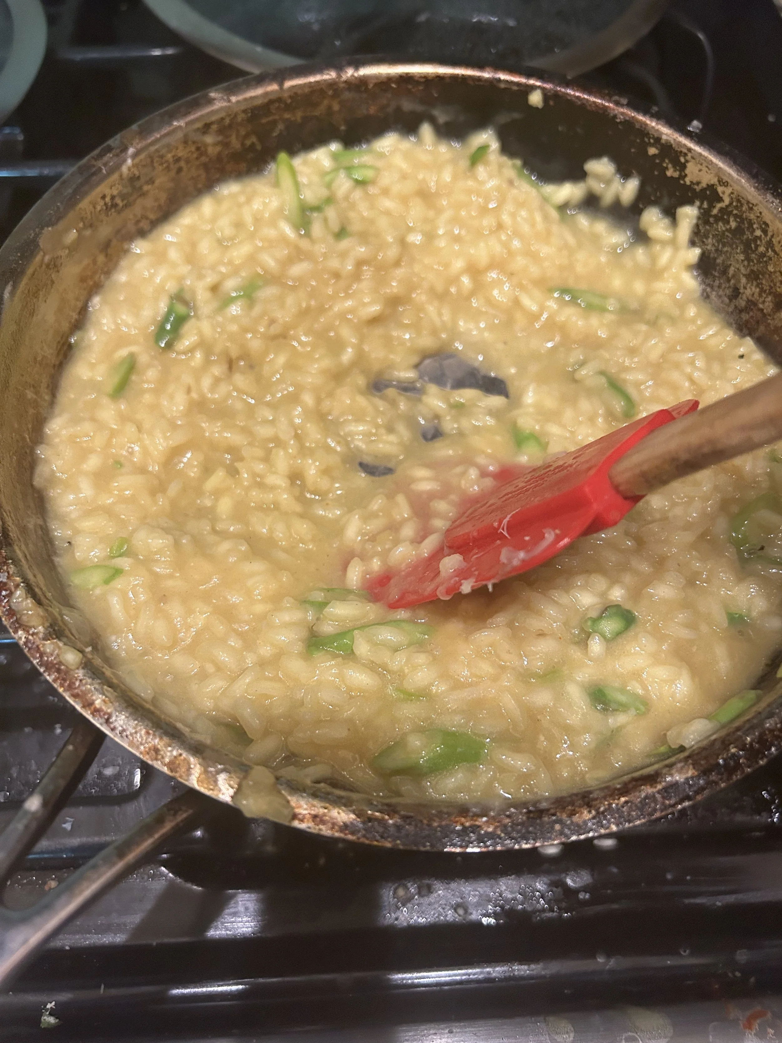 Once the rice is tender but there’s still a good deal of liquid in the pan, stir in the asparagus, take the pan off the heat, then cover and leave the rice to rest for at least 10 minutes.