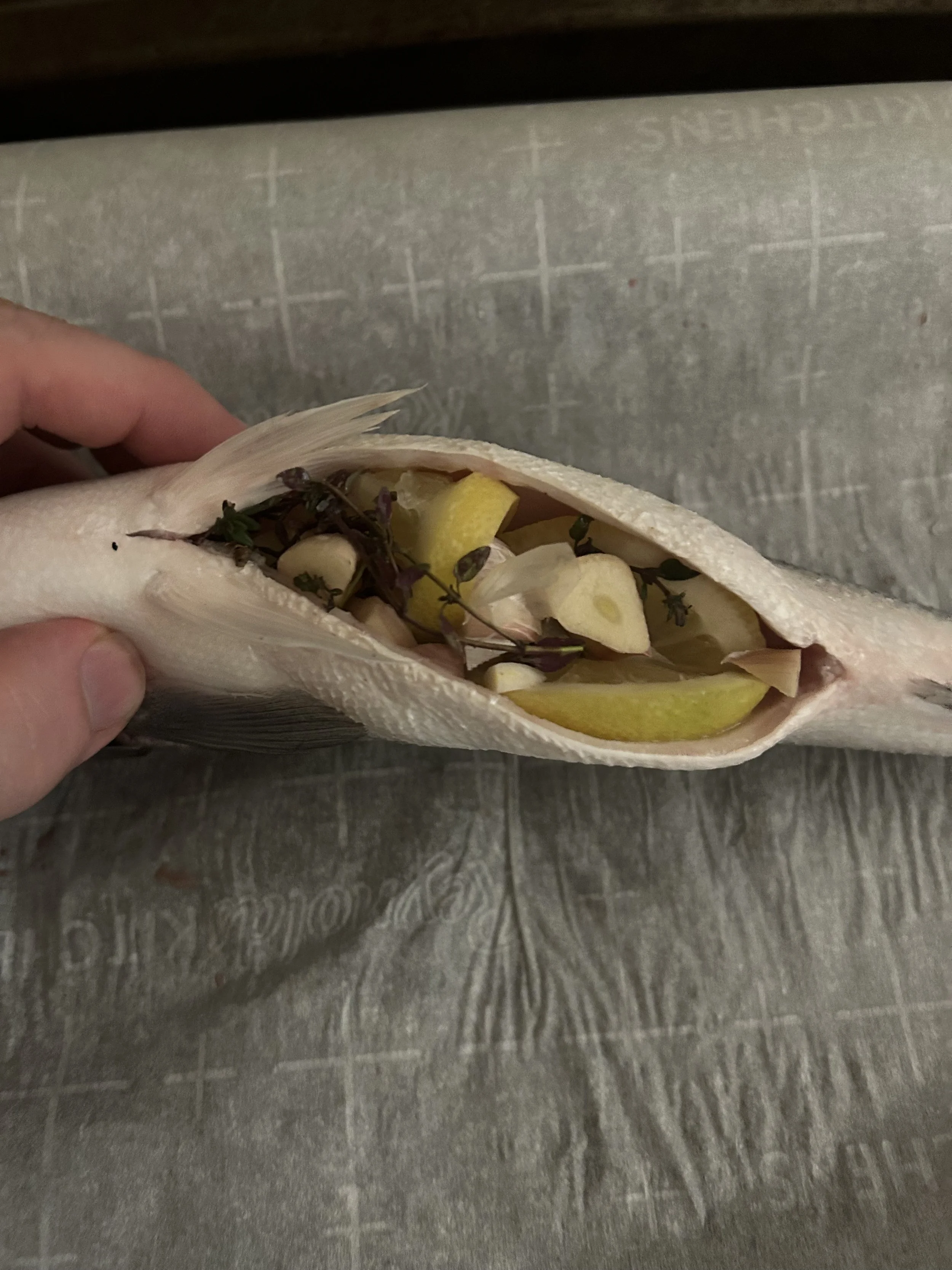 Sprinkle a little bit of salt inside the cavity of the branzini where the guts used to be, since the skin from the fish will be protecting the flesh from the salt crust, making sure you season the inside is important.
