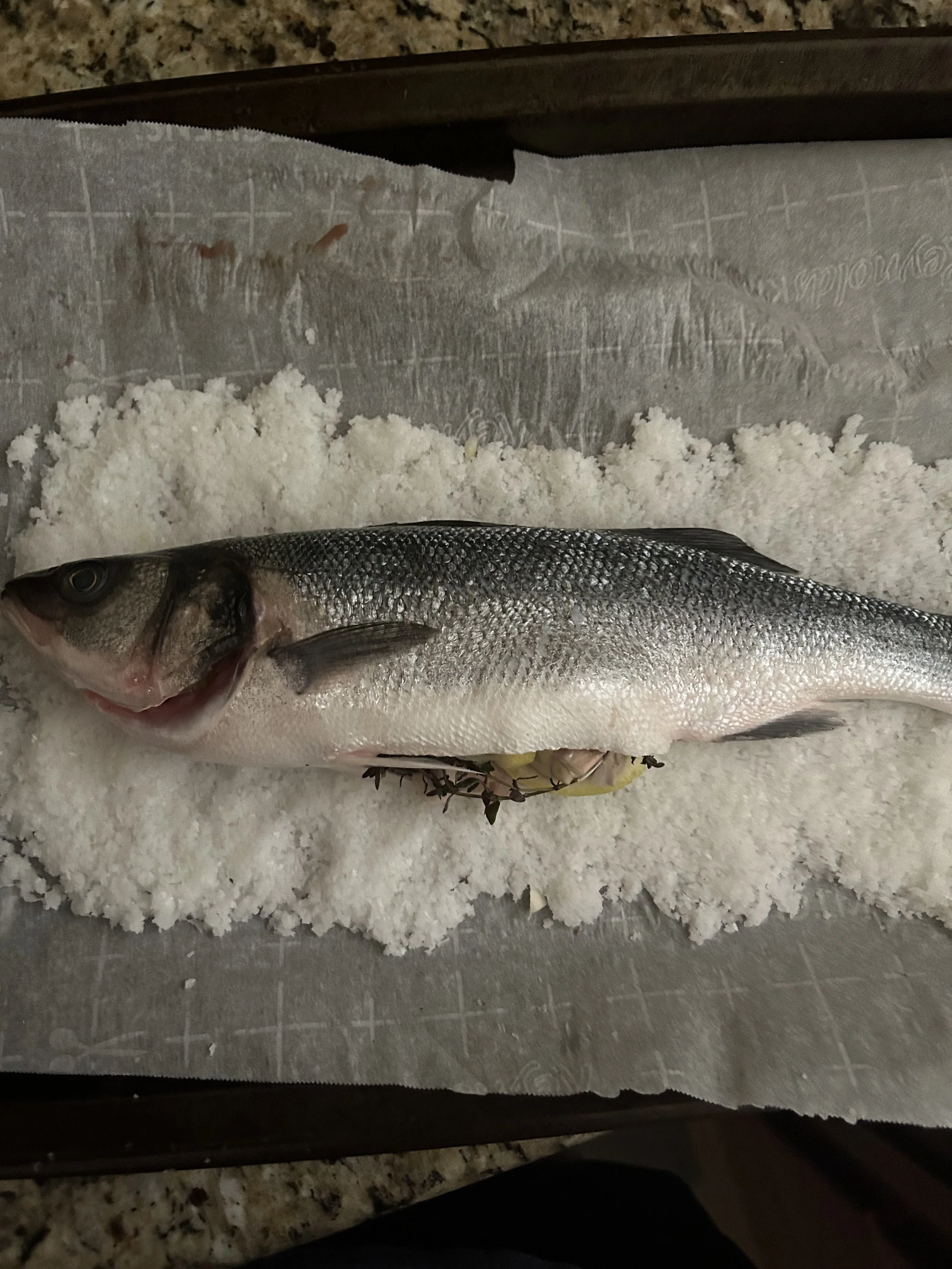 As the branzini bakes with the salt crust, the egg whites will cause the salt to set and form a shell around the fish which will keep the juices and flavor inside the fish where it belongs.