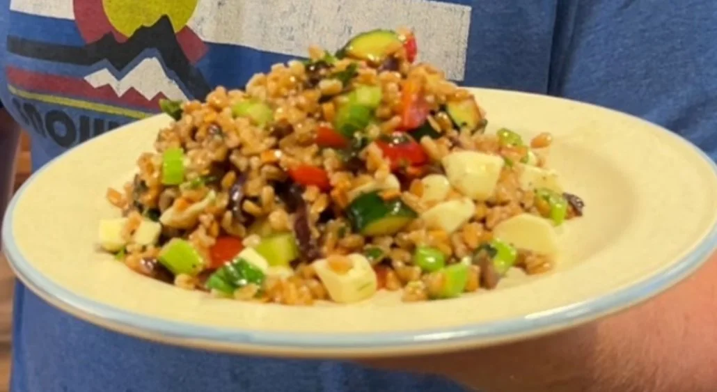 Today, I’m going to be turning farro into a wonderful salad loaded with tons of delicious things like zucchini, caramelized red onion, tomatoes, mozzarella, and a good drizzle of olive oil. I learned how to make this salad in Italy, so I am very excited to share it with you.