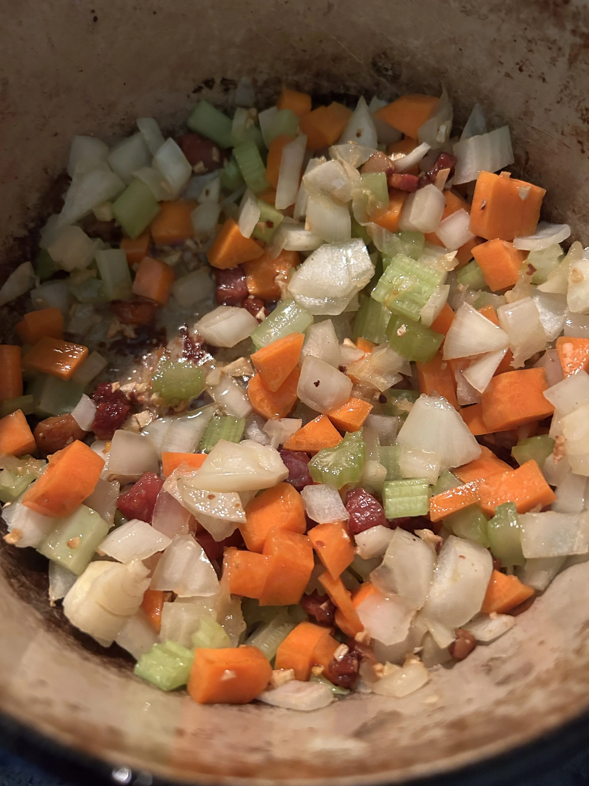 Add the carrot, onion, and celery and cook, stirring often, until the veggies start to brown.