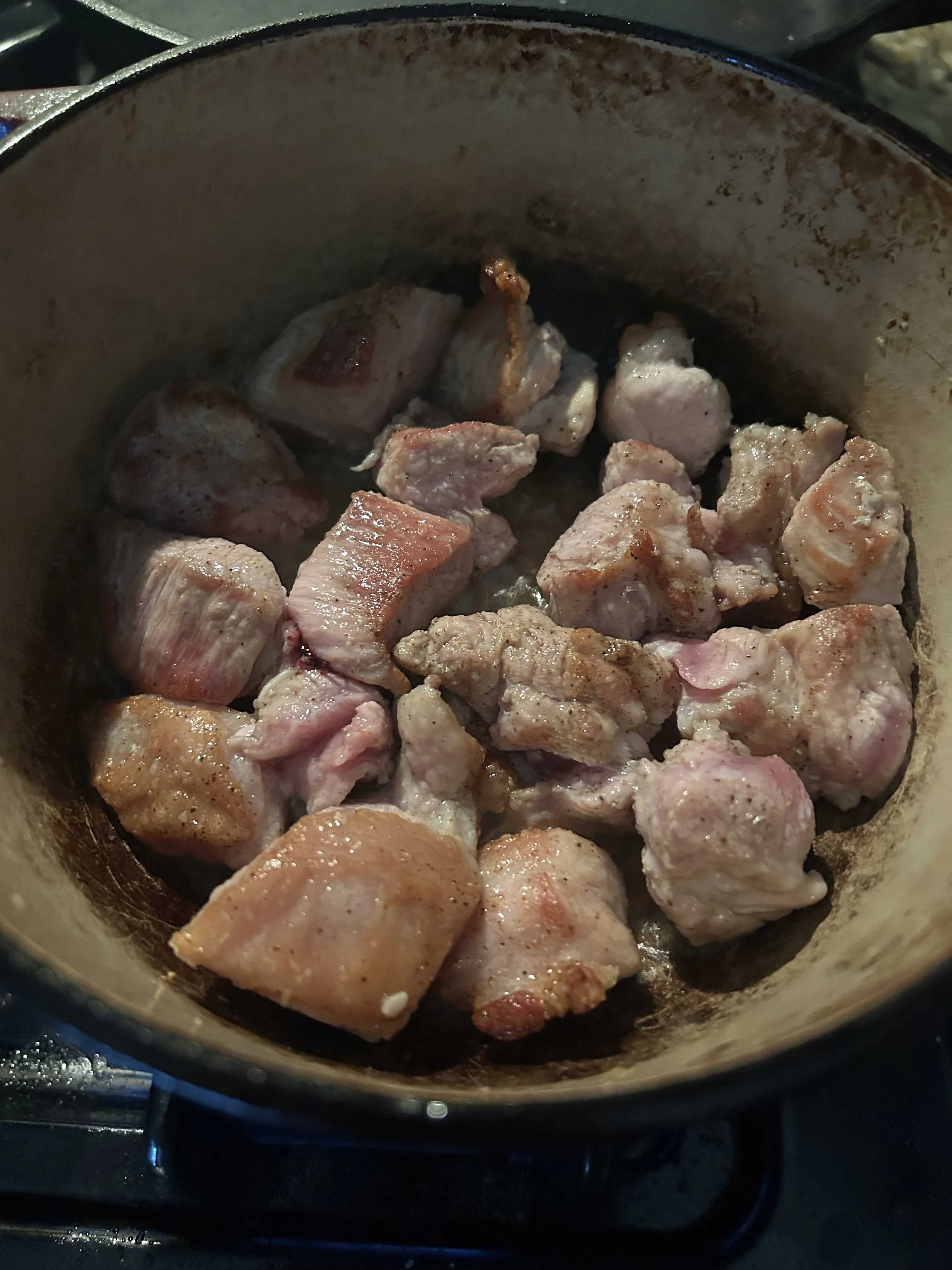 Heat a Dutch oven or other heavy-bottomed pot with the olive oil, then, line the bottom of the pot with a single layer of pork cubes and cook until browned on all sides, you’ll want to do this in batches.