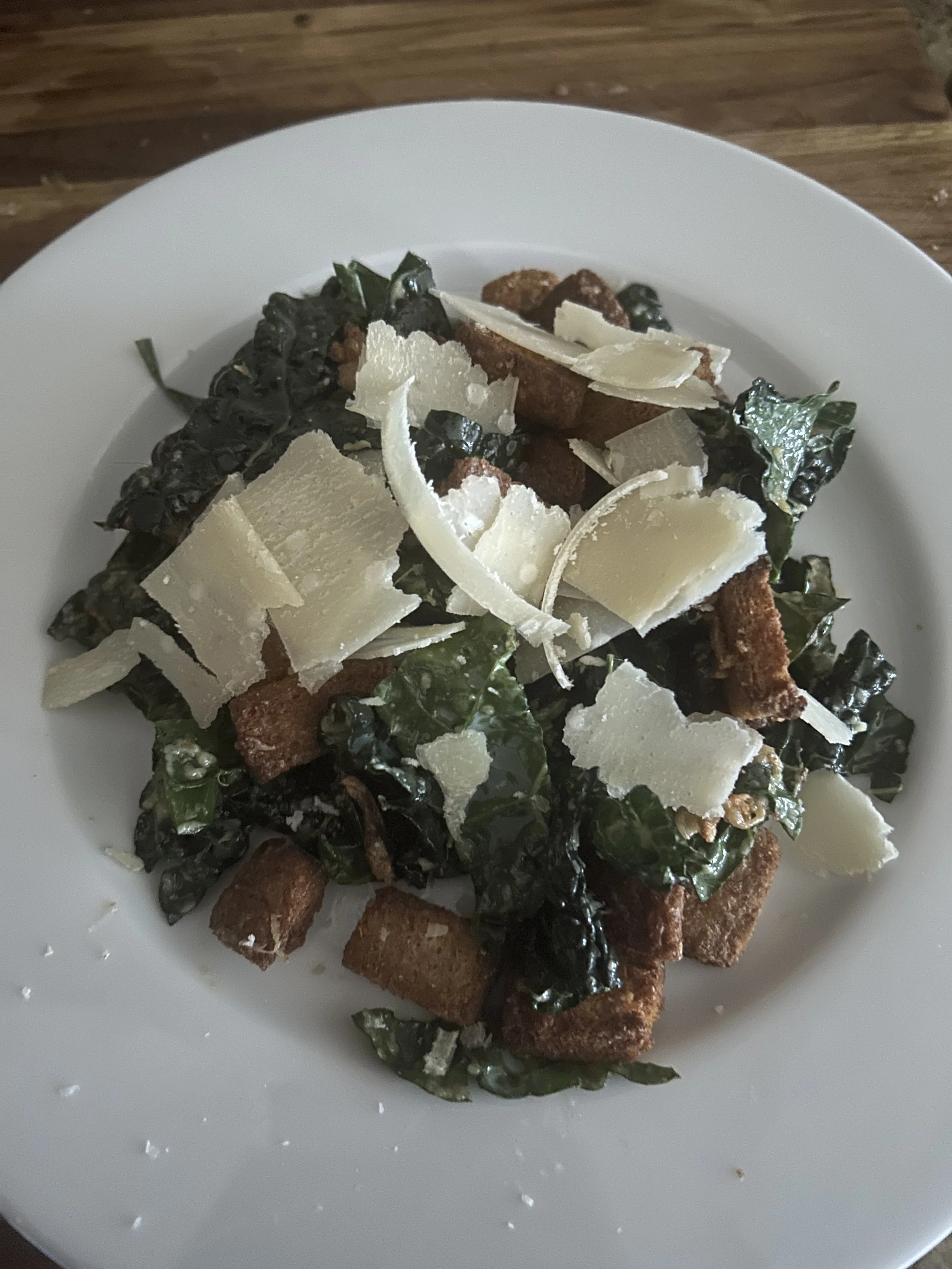 From there, I simply tossed some washed and chopped kale with my dressing, some croutons I had made, and finished with shaved parmesan!