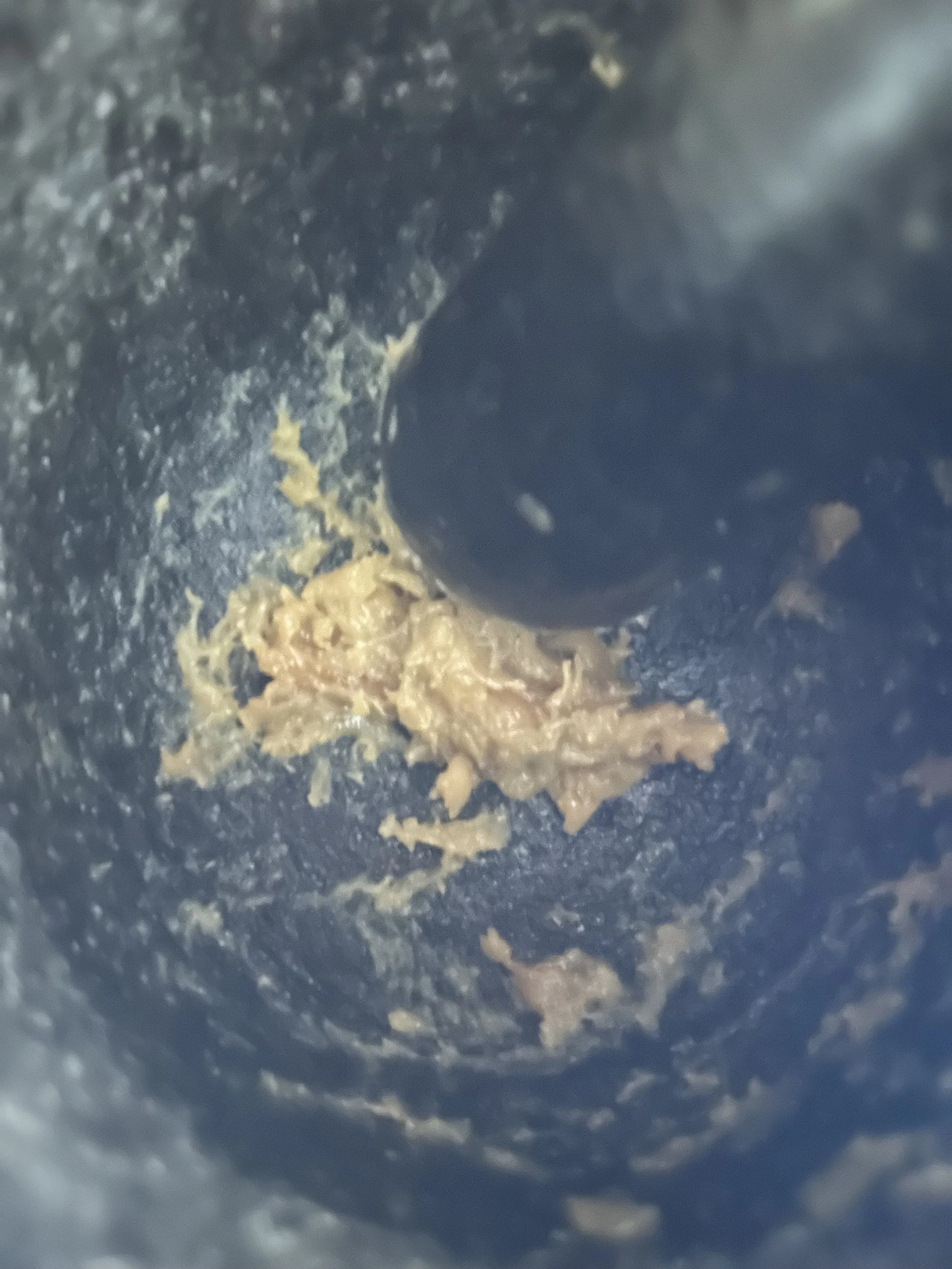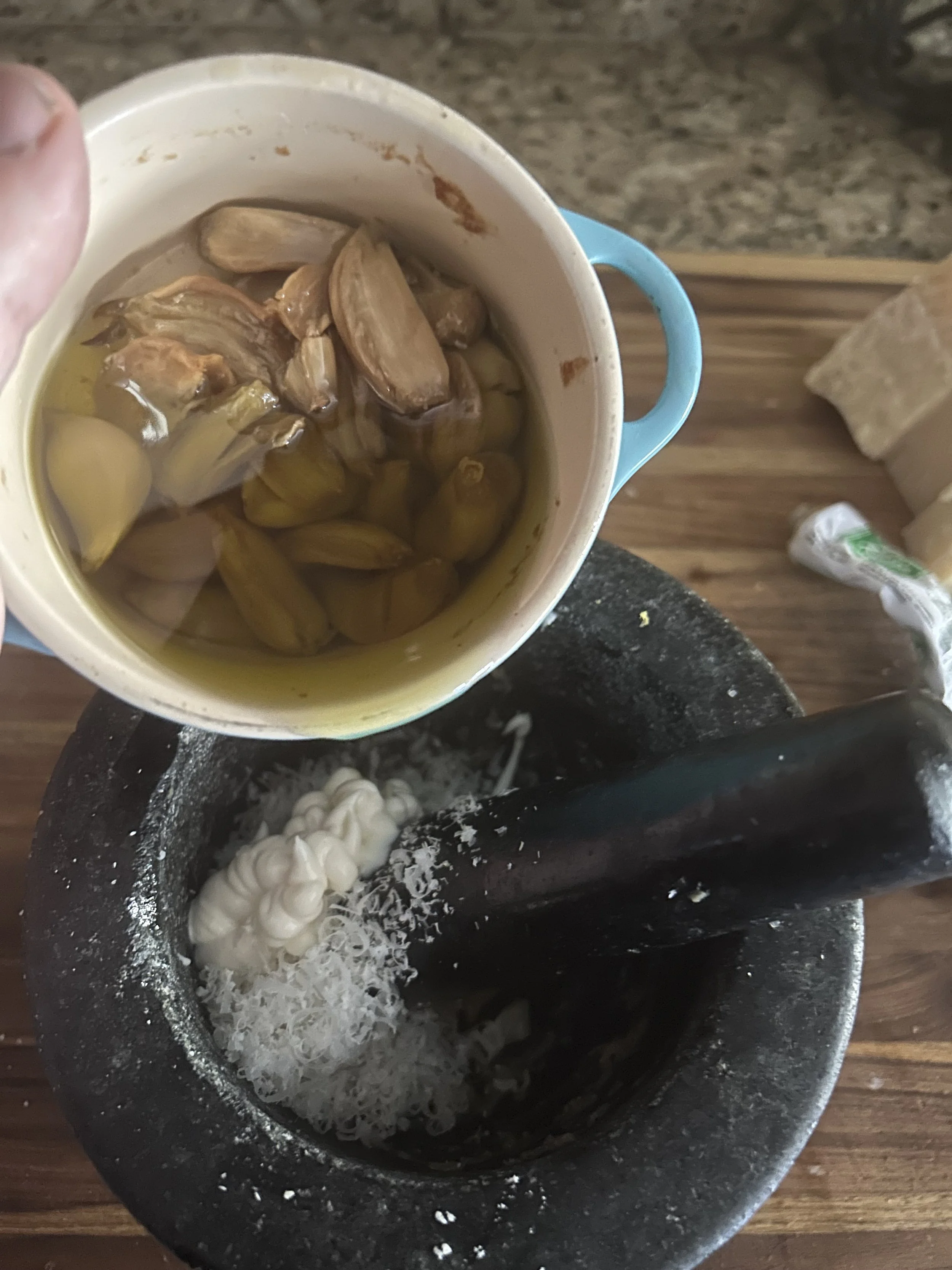I started by bashing some of my beautiful garlic confit cloves. The beauty of this method is that the garlic is so mellow and sweet that you can get away with using three times as much garlic as you normally would.