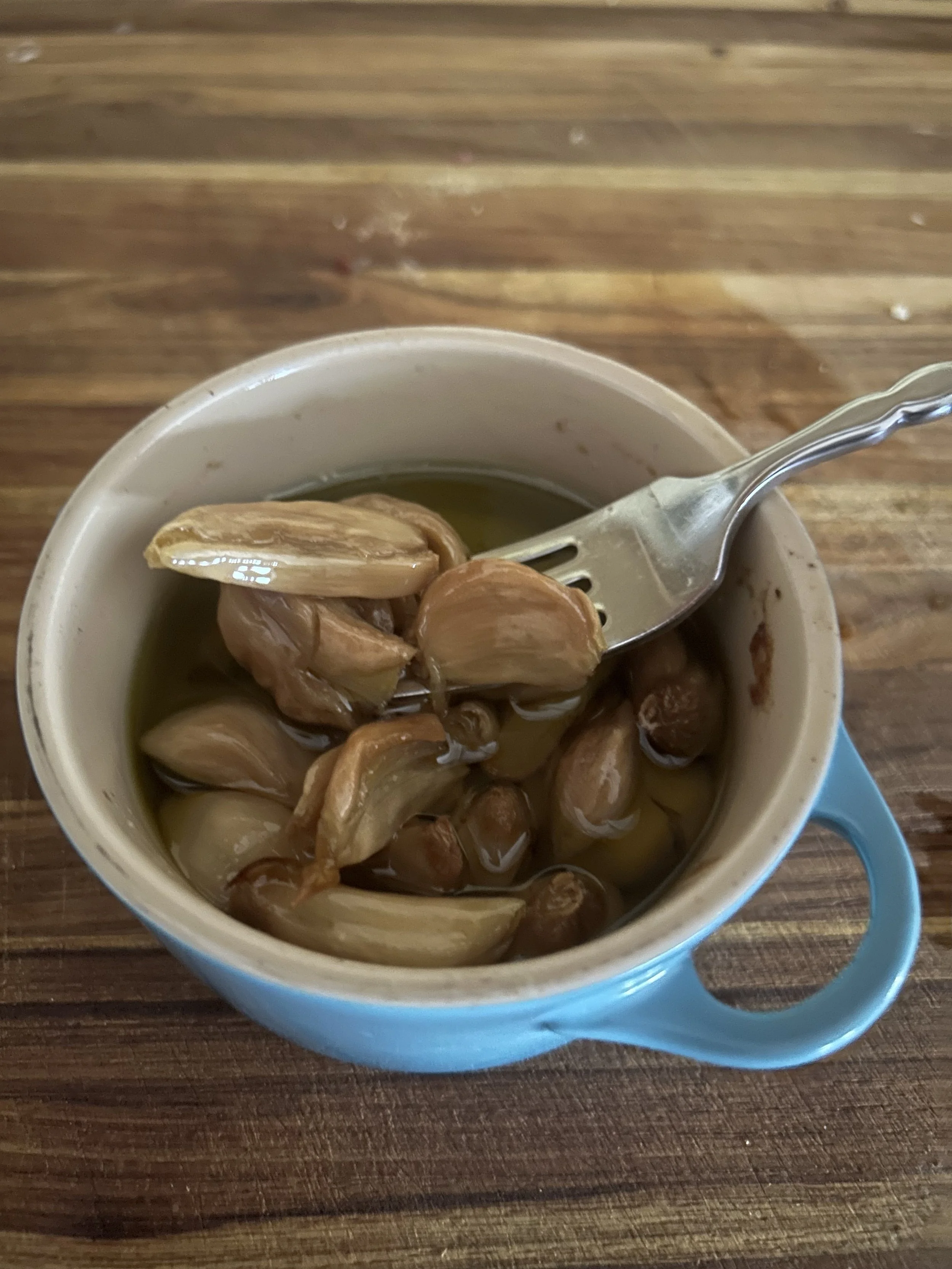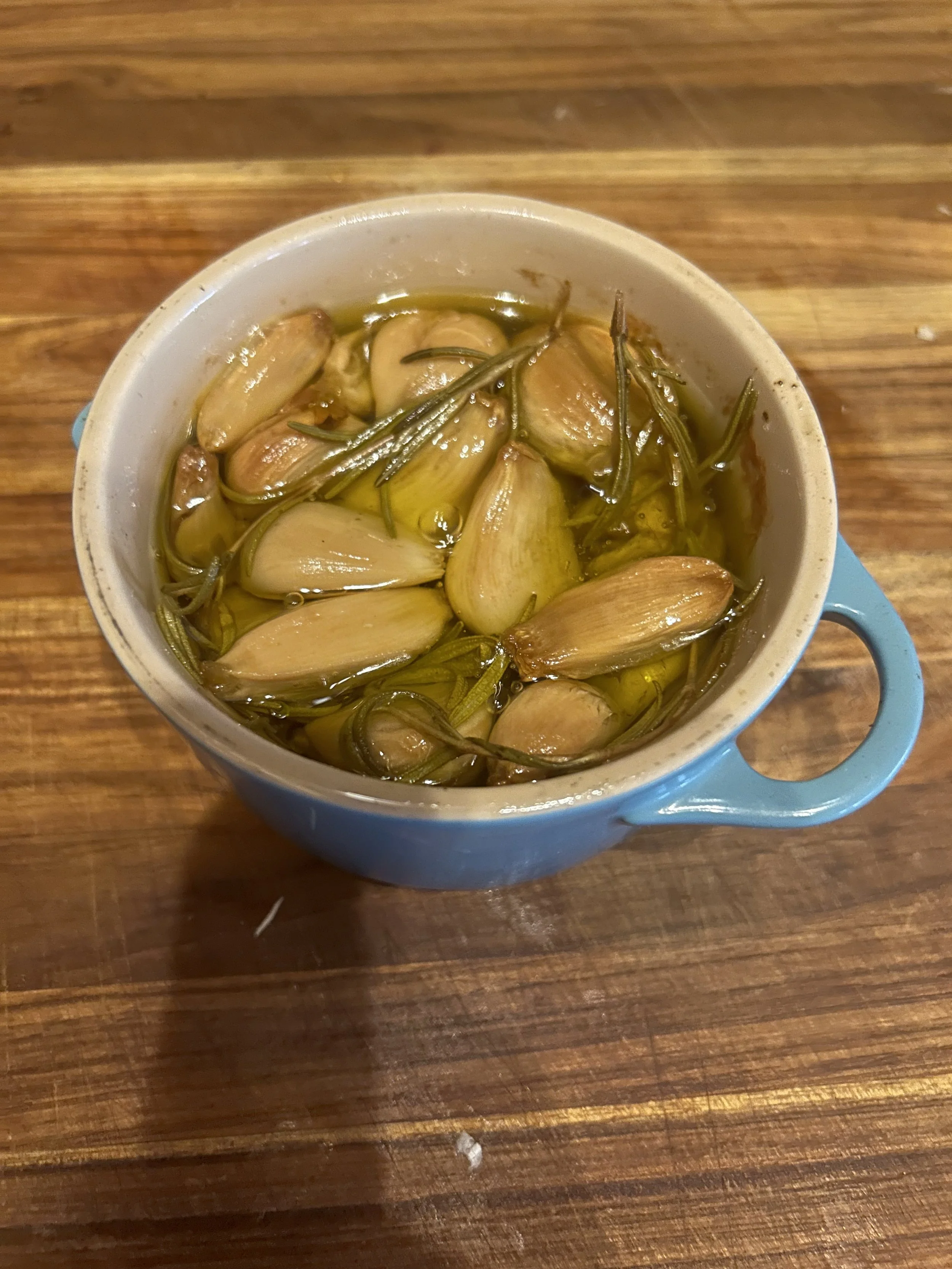 Once all of the garlic is golden and soft, remove the herb sprigs and allow it to cool.