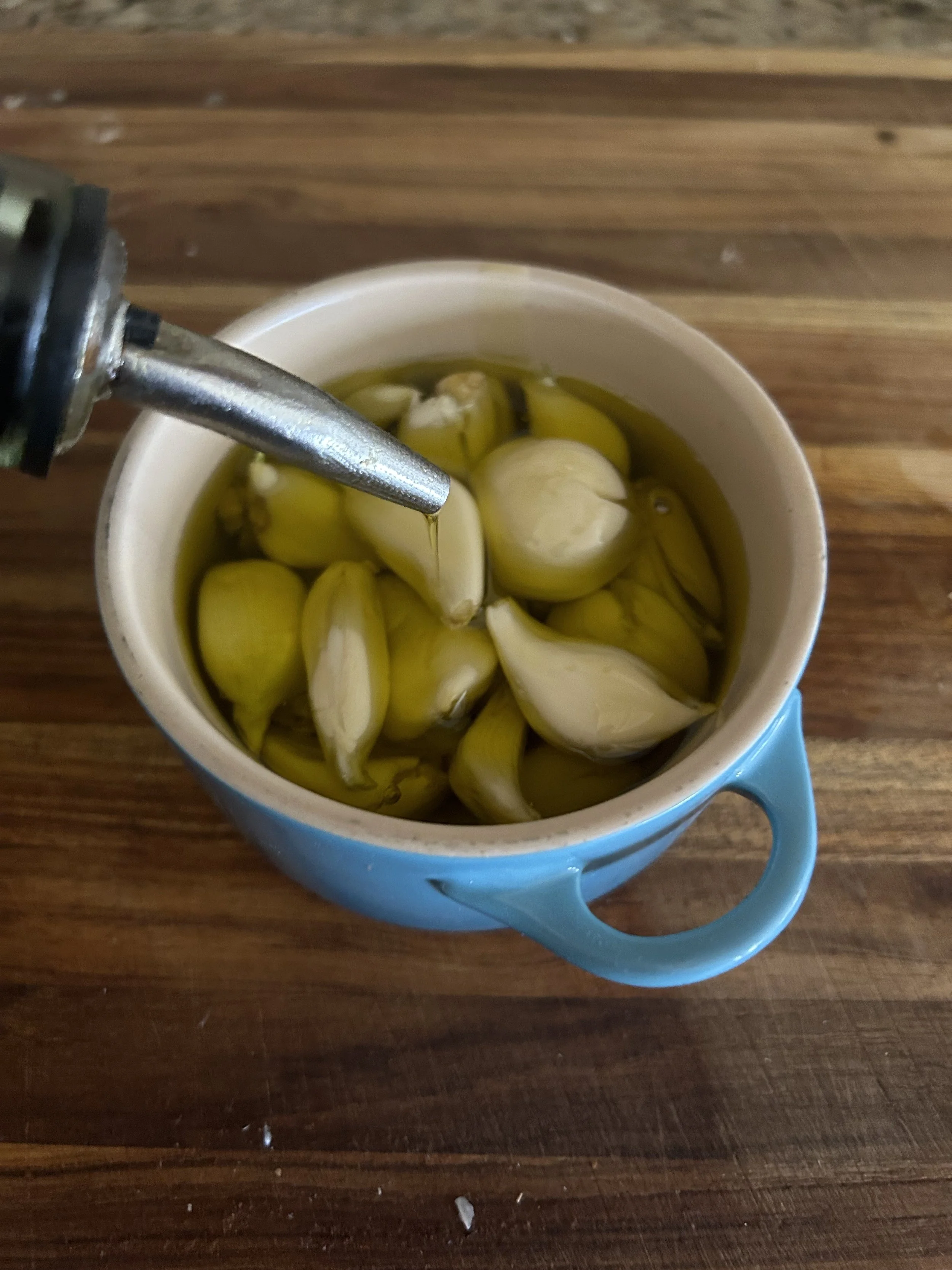 I then proceed to cover my garlic cloves in olive oil. You do not want to be skimpy with the olive oil here as confit is a process that involves covering the food in oil or fat, the oil will impart flavor to the garlic and help break them down to a soft, spreadable consistency.