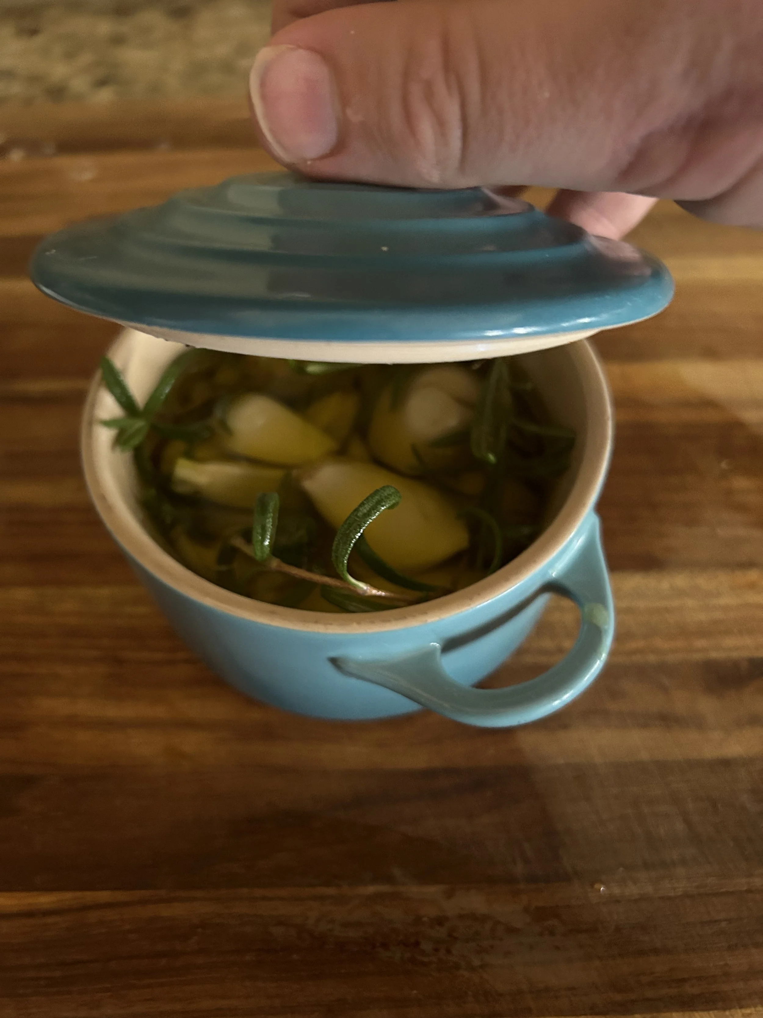 I also added a few little rosemary sprigs to infuse the oil with even more flavor; thyme works great too.