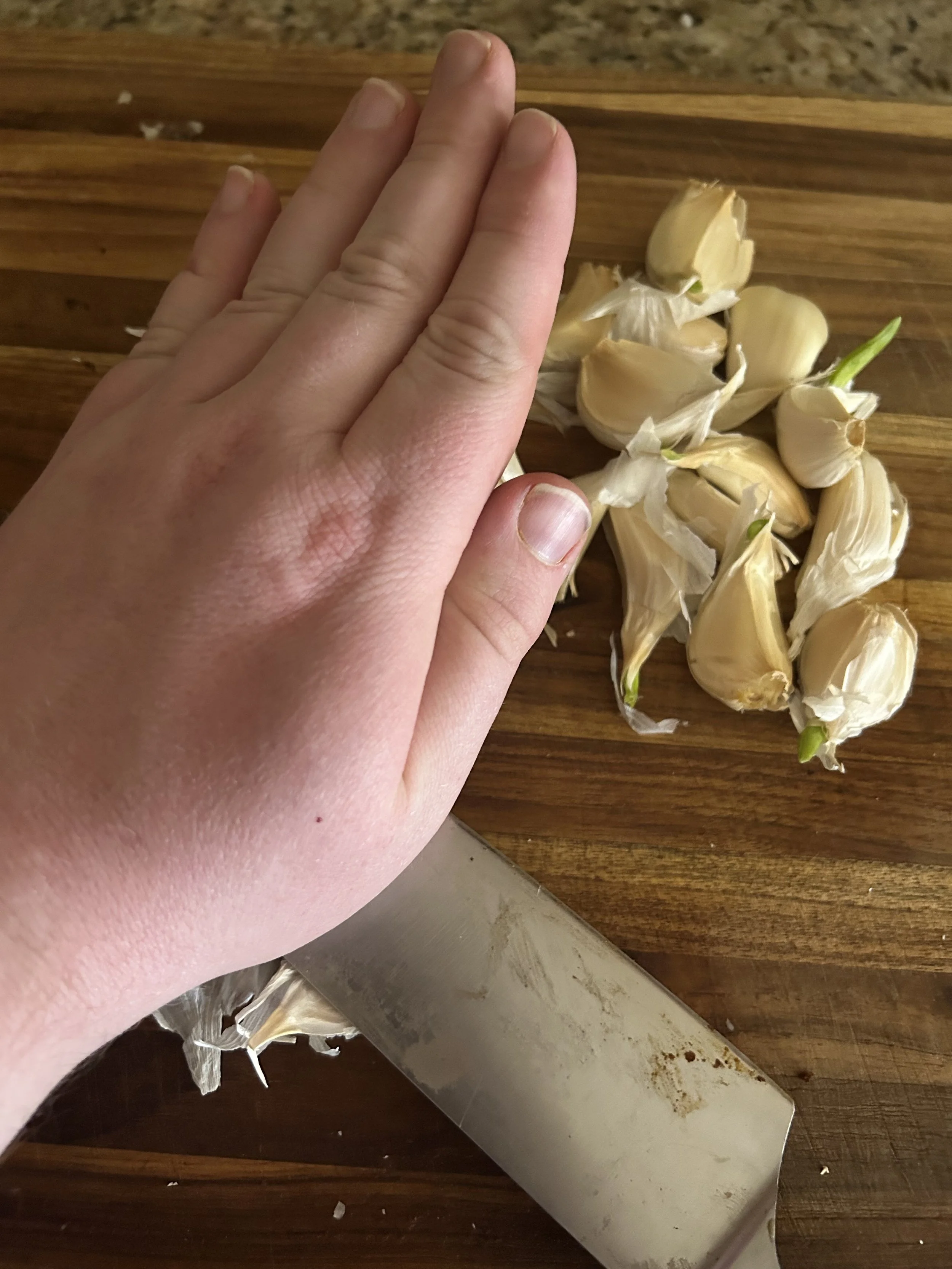 The easiest and fastest way to peel garlic cloves is to lay the side of a knife down on them and give the cloves a light smack, which will allow the skin of the garlic to pop right off.