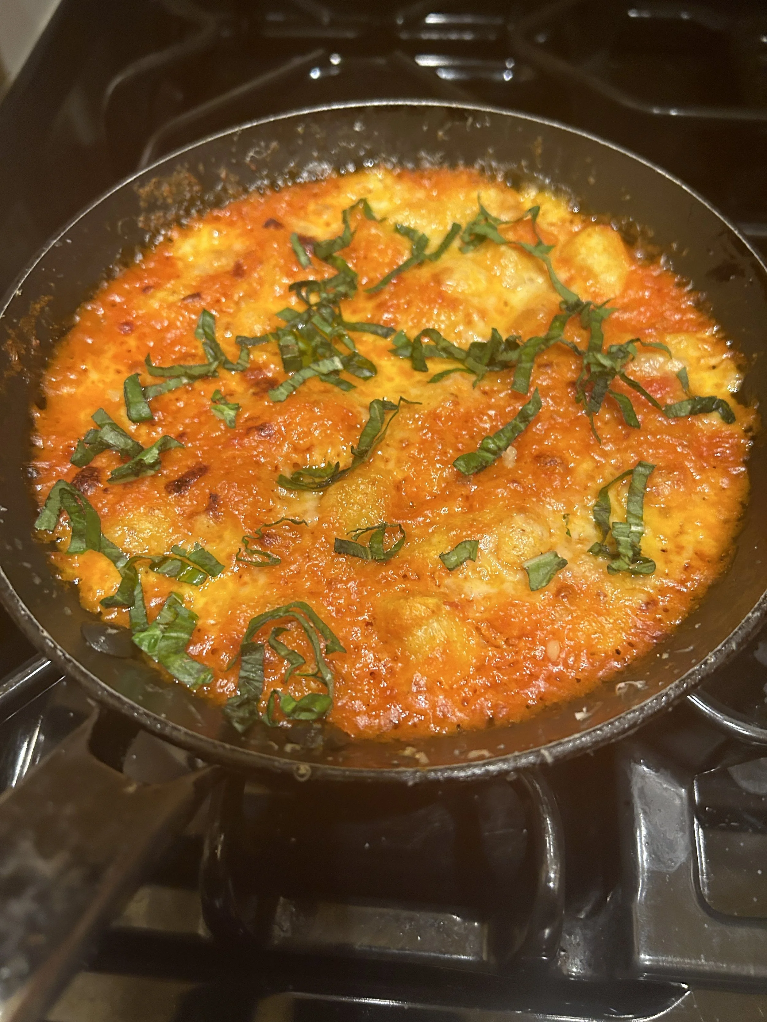 Toss the dumplings with the sauce, then dump into a 10 inch baking dish. Top with the remaining smoked cheese and the Parmigiano, then bake for 10 minutes, or until the cheese is bubbly. Spoon into bowls, then top with shredded basil.